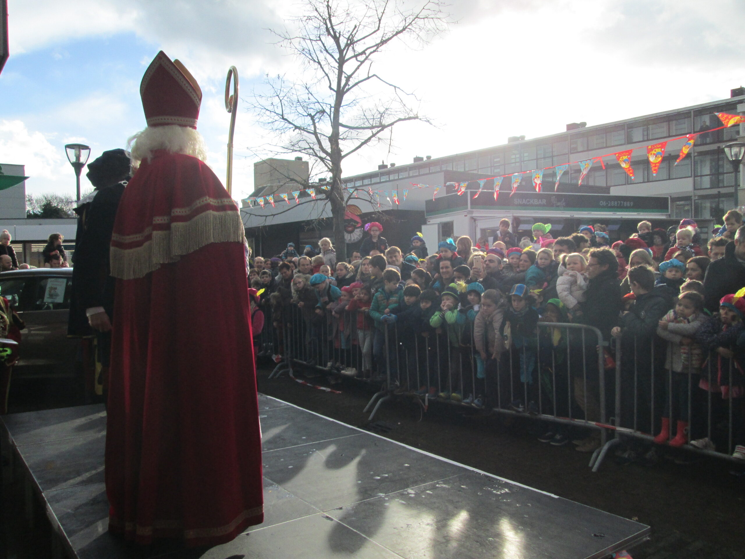 Nadat Sinterklaas langs alle kinderen was gegaan en tekeningen in ontvangst had genomen, sprak hij iedereen op het plein toe. “Er zijn hier lieve kinderen, dus Sinterklaas heeft altijd een goed reden om hier naartoe te komen”, zei Sinterklaas tegen de burgemeester. “En wat gezellig dat jullie er allemaal zijn in zulke grote getalen”, tegen alle kinderen.