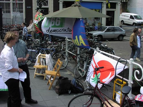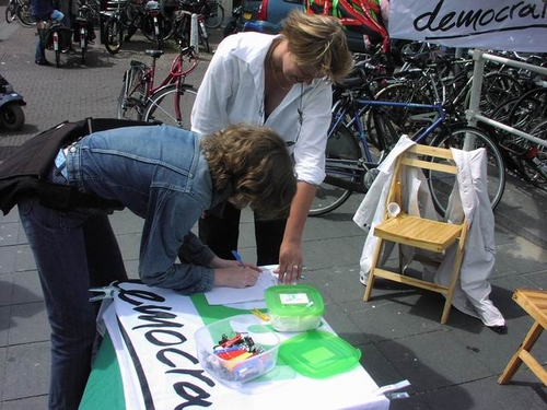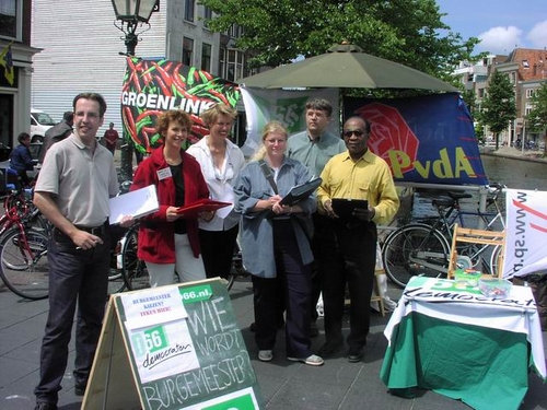 Alsof er nooit een discussie heeft plaatsgevonden over de voor- of nadelen van een gekozen burgemeester stonden maar liefst vijf college- en oppositiepartijen zaterdagmiddag in het centrum van Leiden handtekeningen in te zamelen. Okee toegegeven, de PvdA had ook een blaadje voor tegenstemmers, maar of dat nog veel uitmaakt valt te betwijfelen. Na een uurtje was de stand 5 tegen 3 in het voordeel van een gekozen burgemeester. Overigens lijkt de partij zich al definitief achter een burgemeestersreferendum te hebben geschaard. Van de meer dan 80 emails die de PvdA vrijdag had binnengekregen naar aanleiding van de ledenpeiling, is een ruime meerderheid voor het referendum. En wat de leden willen, dat gaat de fractie doen.