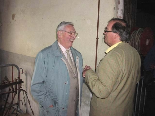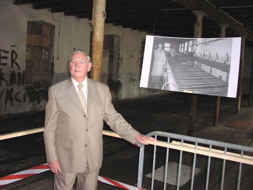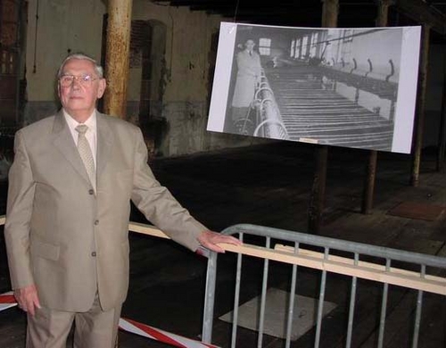 Een van de bezoekers was zaterdag de laatste bedrijfsleider van Scheltema. De heer Van der Sande poseert, zoals hij in 1958 ook op de foto werd gezet in het jaar dat de fabriek werd gesloten. Foto`s: Chris de Waard.