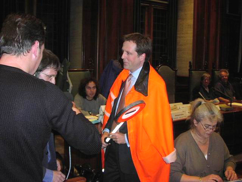 'Klaarover' Pechtold moet ervoor zorgen dat de vele schoolkinderen veilig de Lammenschansweg over kunnen steken als de RijnGouweLijn daar is aangelegd. Buurtbewoners overhandigden hem naast 300 petities ook alvast een passende outfit. (foto: Chris de Waard).