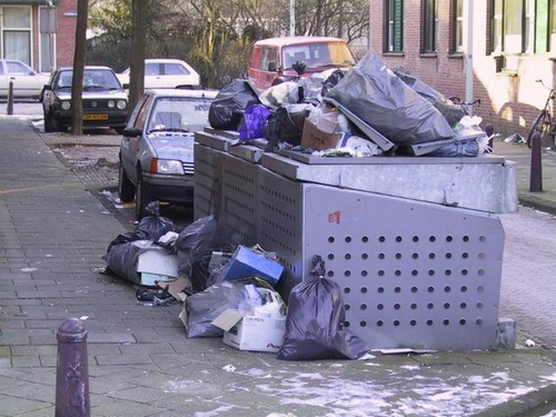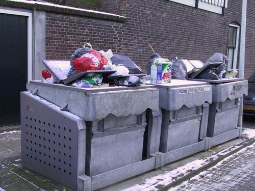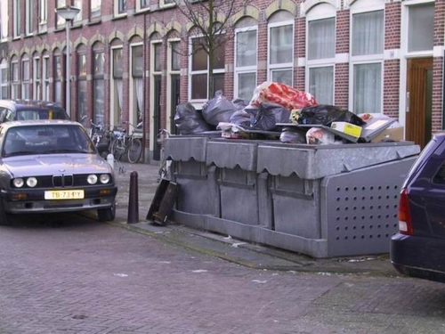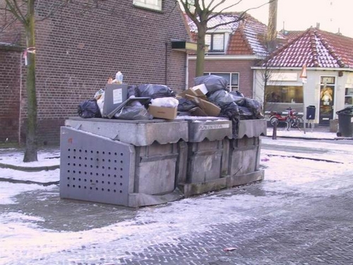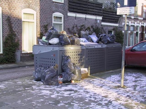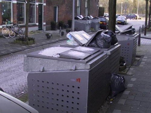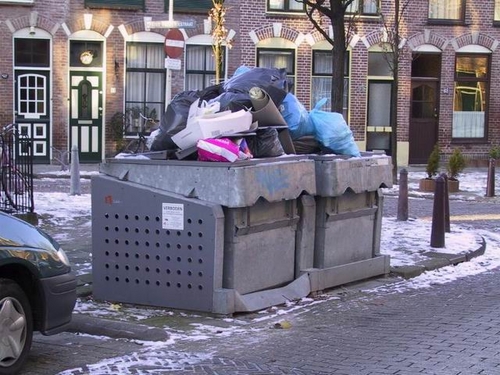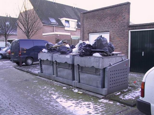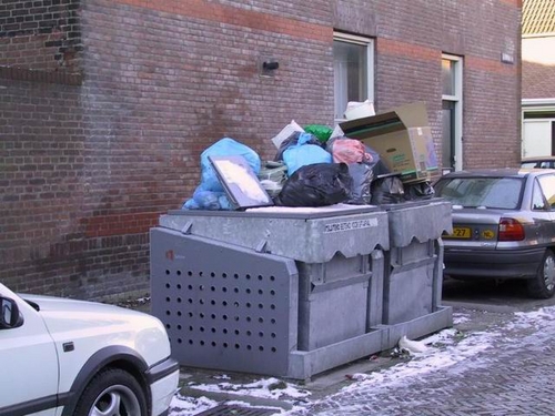 Overvolle wijkcontainers in Leiden-Noord. Hier bij 'De Rondedans' (Foto's: Bram Pater).