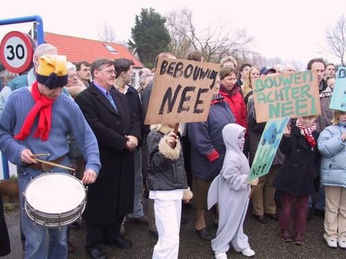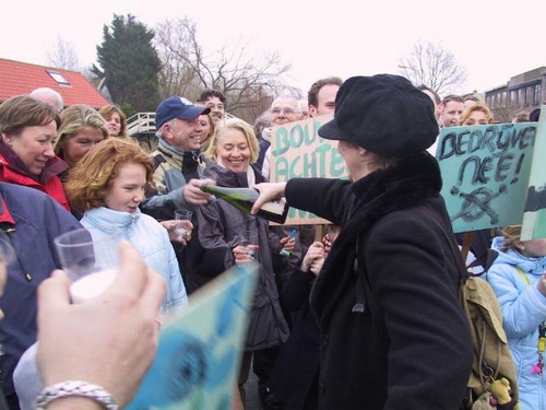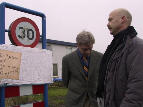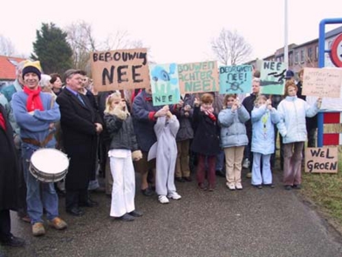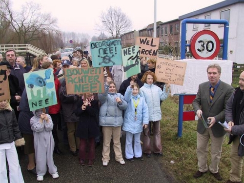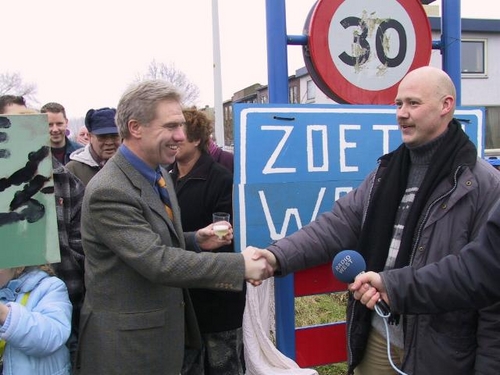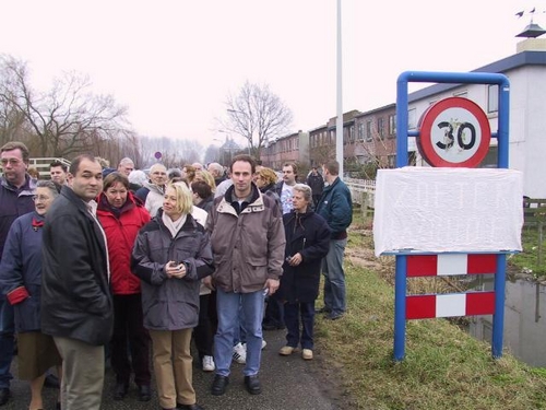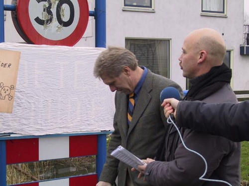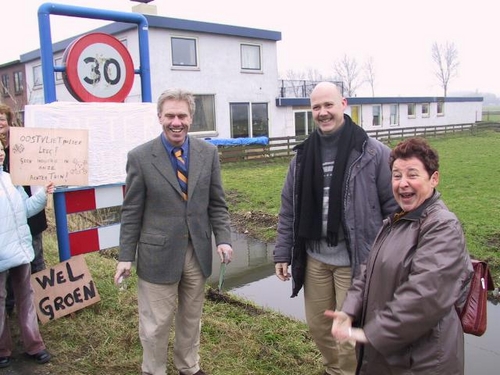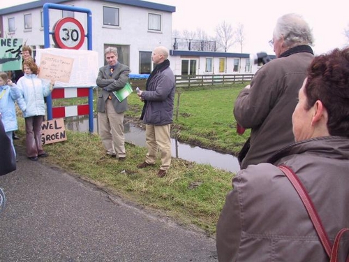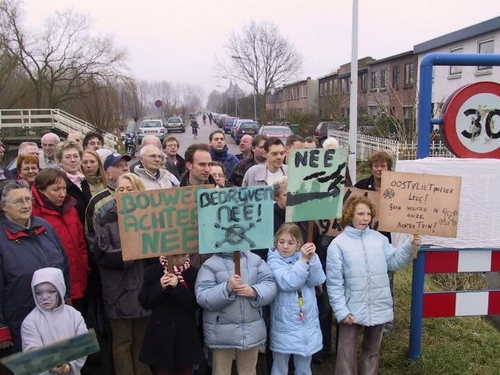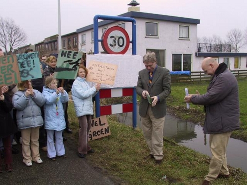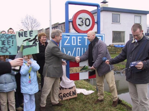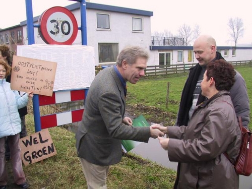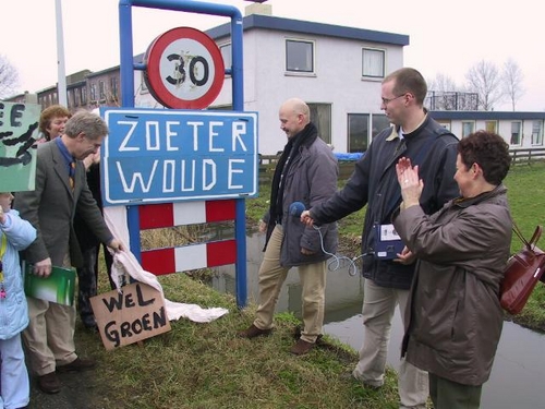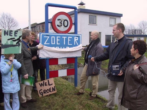 Wethouder Geertsema bestrijdt de kritiek. “We hebben de bewoners juist in een heel vroeg stadium bij de plannen betrokken. Ik begrijp dat ze het niet leuk vinden, maar we verzwijgen niets.” De bewoners lieten vrijdagmiddag door BN-ner Wim Rijsbergen een plaatsnaambordje van Zoeterwoude onthullen. De Vrouwenweg was vroeger Zoeterwouds grondgebied. “Jullie zijn welkom hoor,” liet de Zoeterwoudse burgemeester Koopmanschap zich bij die gelegenheid ontvallen. “Vreemd,” zo oordeelt de Leidse wethouder Geertsema. “Dan is ze kennelijk vergeten dat Zoeterwoude in 1960 de woningen aan de Vrouwenweg al heeft ‘wegbestemd’ om plaats te maken voor een villawijk.”