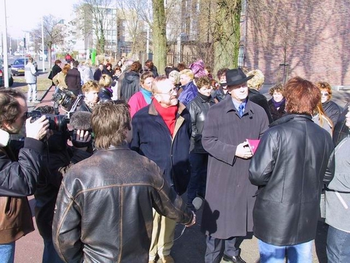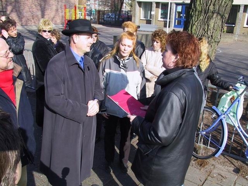Tientallen ouders protesteerden vrijdagmiddag tegen de vorming van een Brede School in Leiden-Noord. Daarbij werden ingezamelde handtekeningen overhandigd aan directeur Visser van de Protestants Christelijke Schoolvereniging waar De Springplank onder valt (foto's: Bram Pater).
