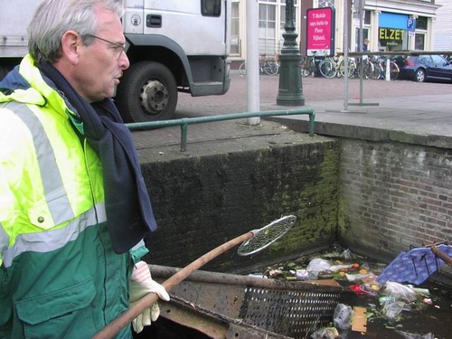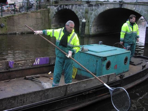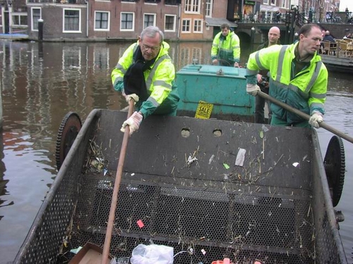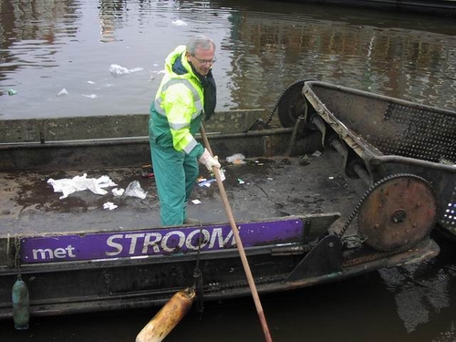 Bij de Waag had veel vuil zich opgehoopt in een hoekje waar de boot niet goed bij kon. Scheppen dus! (foto's: Chris de Waard).