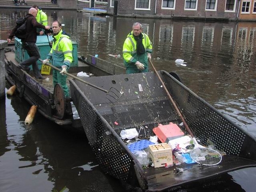 De schoonmaaktocht op het water ging vanaf het terrein aan de Admiraal Banckertweg (Industrieterrein De Waard), via de marktroute naar de Beestenmarkt en terug.