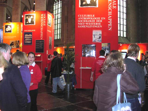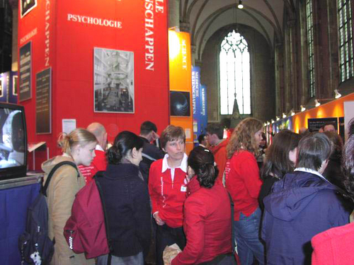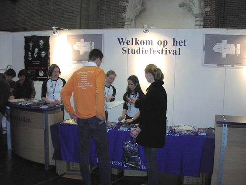 Zo’n 2500 mensen bezochten zaterdag het Studiefestival dat de Universiteit Leiden organiseerde in de Pieterskerk en de omliggende gebouwen. Dat waren er een paar honderd meer dan op het vorige festival in oktober vorig jaar. “Maar toen waren er problemen met de treinen en dat scheelt al snel een paar honderd bezoekers,” zo vertelt een van de voorlichters van de UL.