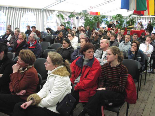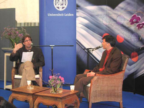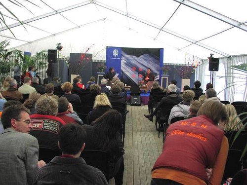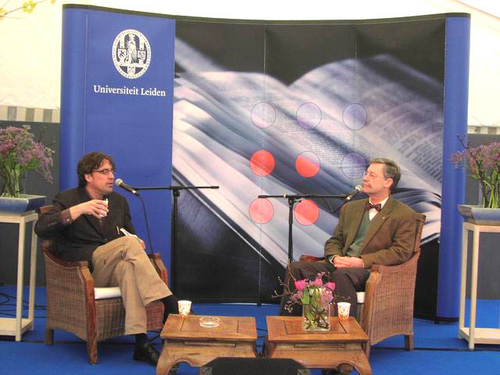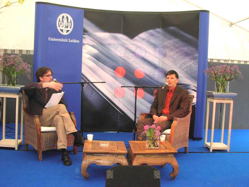 In een tent op het Pieterskerkplein internviewde schrijver Joost Zwagerman bekende wetenschappers. Ook daarvoor was de belangstelling groot. Zwagerman is dit jaar gastschrijver bij de Universiteit Leiden.