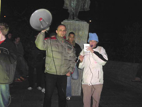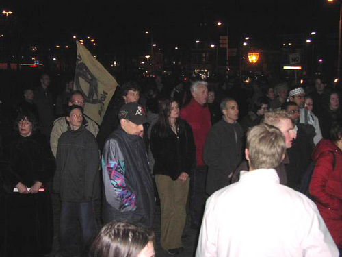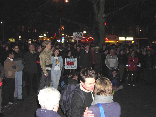 Tijdens een ‘burgerbijeenkomst’ in de Vrijplaats Koppenhinksteeg discussieerden de aanwezigen over een verklaring met eisen aan de politiek en over verdere acties tegen de oorlog.