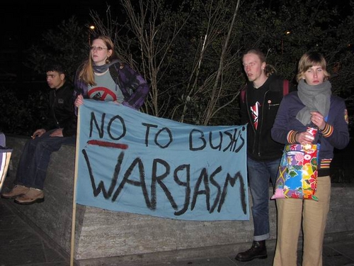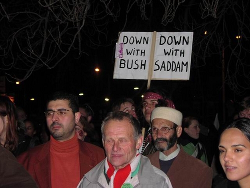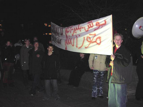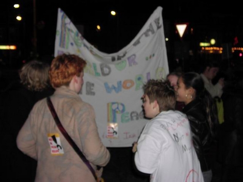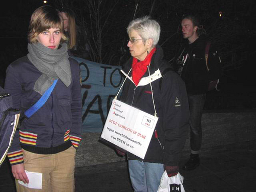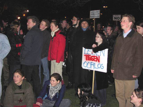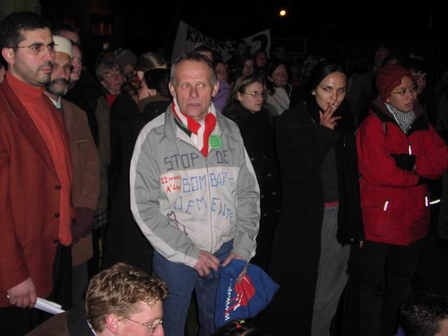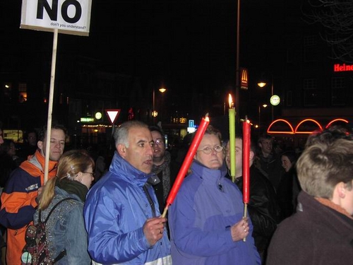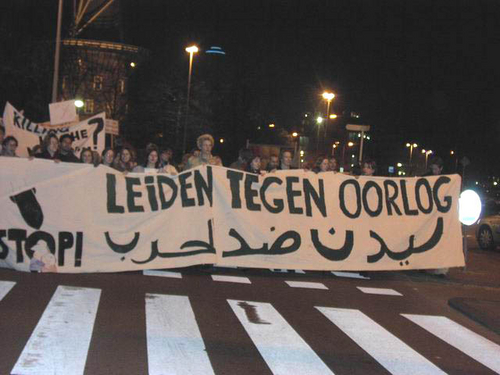 Wij, inwoners van Leiden, zijn tegen de aanval van de Verenigde Staten en haar bondgenoten op Irak. Wij denken aan de bevolking van Irak die het de komende dagen zwaar te verduren krijgt. De oorlog is niet rechtvaardig. Wij eisen: