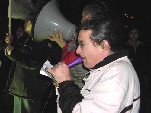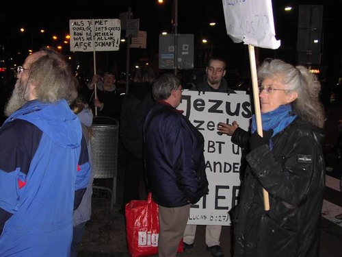 Via de Langegracht liepen de demonstranten naar het pand van Eurodusnie aan de Koppenhinksteeg (Foto: Chris de Waard).