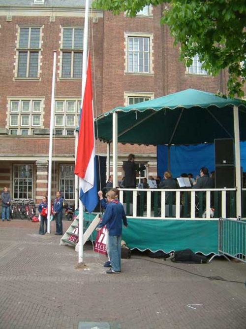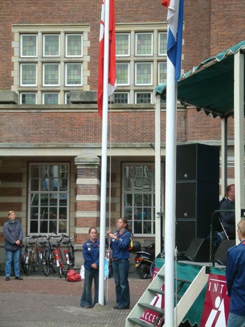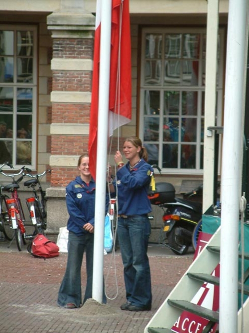De scouts van de Lodewijksgroep hezen traditiegetrouw de vlaggen op het Stadhuisplein. Gebroederlijk wapperden de Leidse en de Nederlandse vlag naast elkaar.