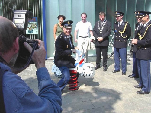 De dienst Milieu en Beheer en de LWO verrasten de de politie met een origineel cadeau; een wipmotor.