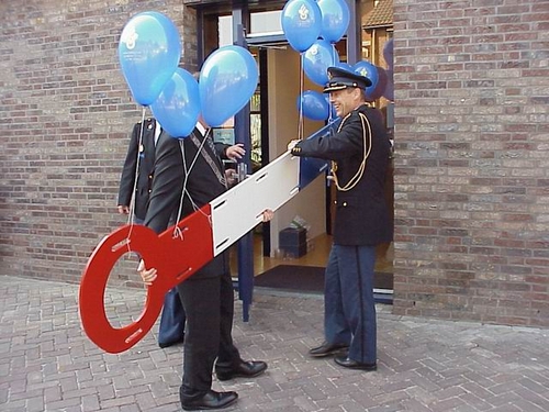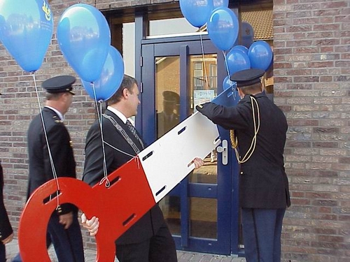 Afgelopen woensdag heeft burgemeester Lenferink het nieuwe Politiebureau Zuid geopend. Met een enorme sleutel werd het pand symbolisch geopend. Lenferink was in de leer geweest bij “Wessie de wijkinbreker”, dus dat ging hem goed af.