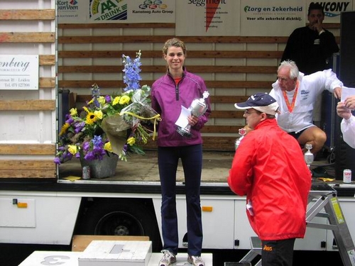 Naast de snelste lopers was er nog een speciale huldiging; die van Vrijwilliger van het jaar van de Leiden Marathon (Foto's: Chris de Waard & Marjo Heemskerk).