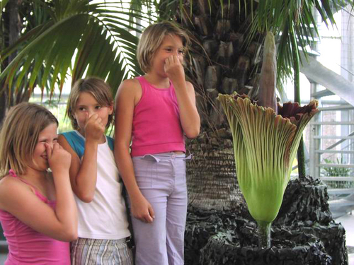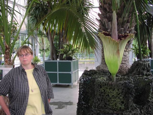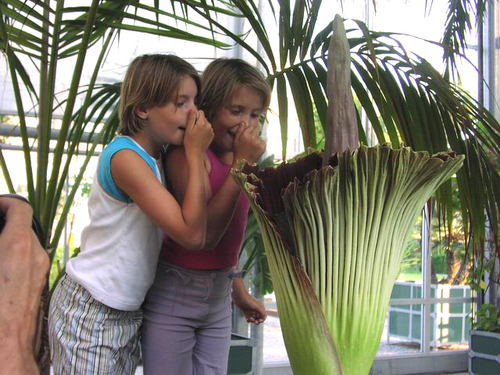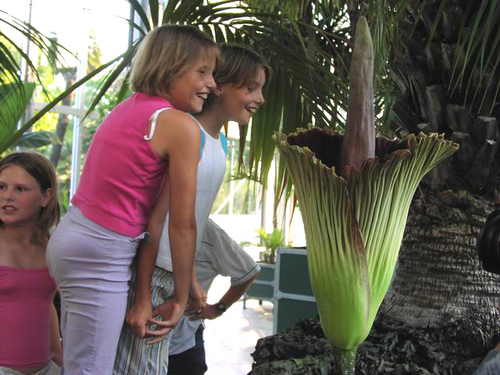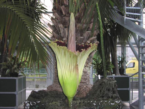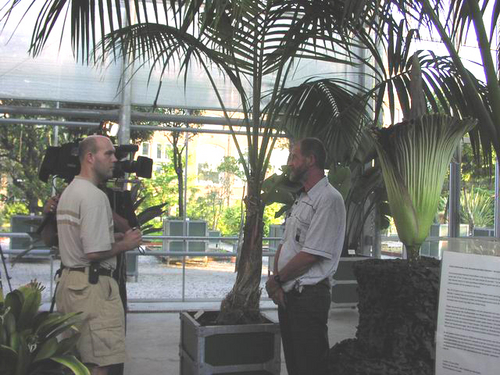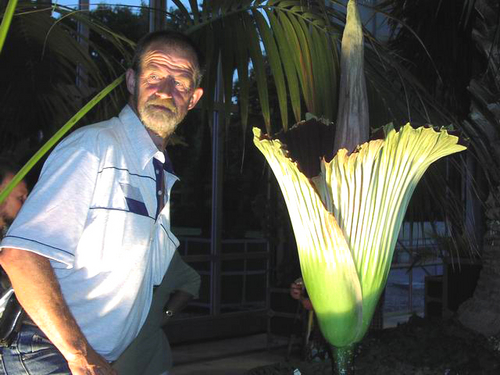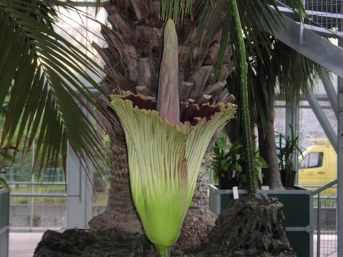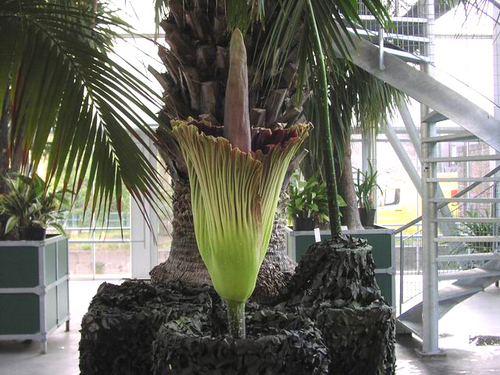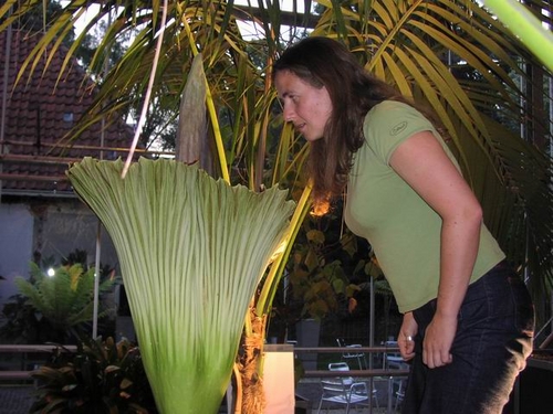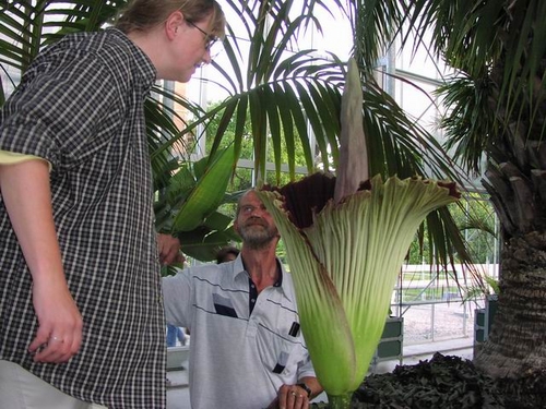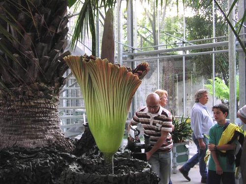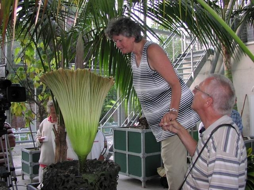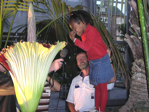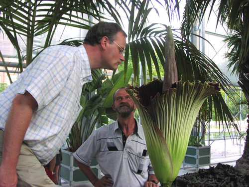 Maandagavond is in de Hortus de Reuzen Aronskelk gaan bloeien. Kasbeheerder Art Vogel had eigenlijk verwacht dat de plant al zondag tot bloei zou komen, maar dat liet dus een dagje langer op zich wachten. Vogel hoopt dat vele bezoekers dinsdag een kijkje komen nemen naar de bijzondere plant die slechts eens in de tien jaar bloeit. “In Engeland bloeide er laatst eentje, daar kwamen in een weekend 30.000 mensen op af. Hier mag je blij zijn met 1000 bezoekers,” zo verklapte hij een beetje jaloers. In elk geval had de Hortus over media-aandacht niet te klagen. De radio-, tv- en dagbladjournalisten verdrongen elkaar voor een shot van de sterk riekende penisplant.