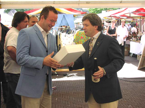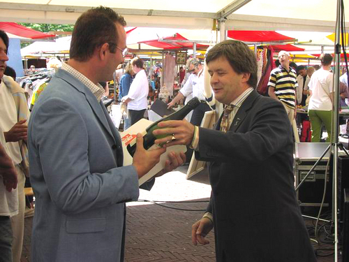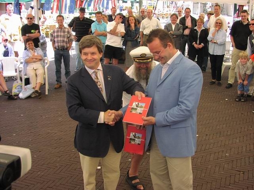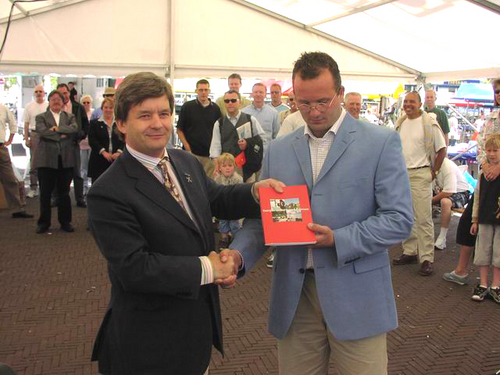 Wethouder Geertsema neemt de eerste vaargids in ontvangst uit handen van schrijver en uitgever Dick Baaij (foto's: Chris de Waard).