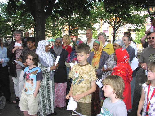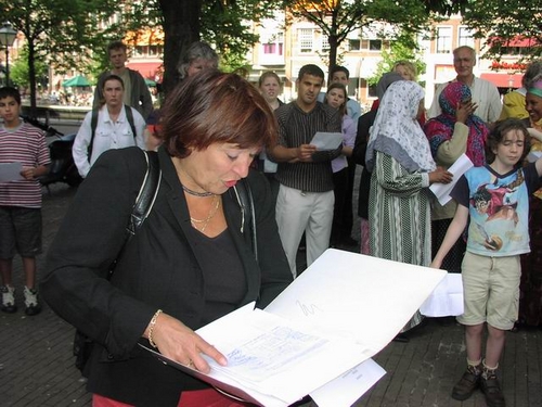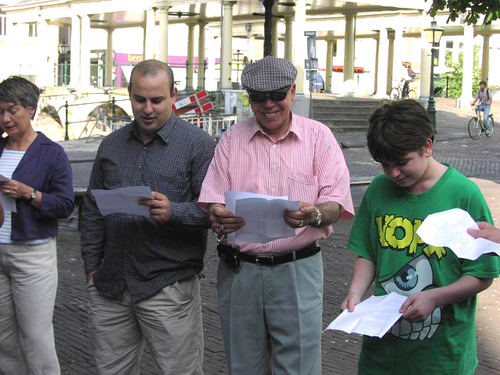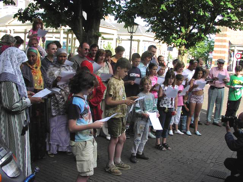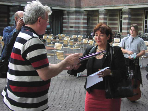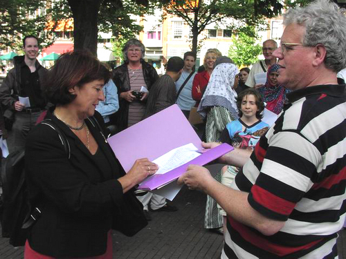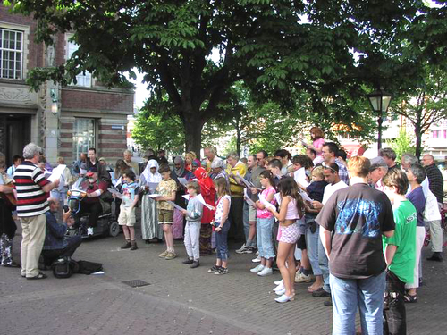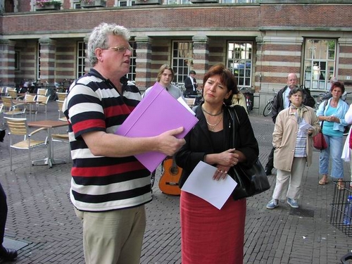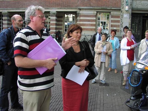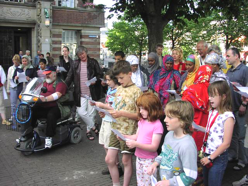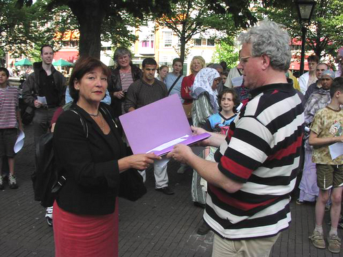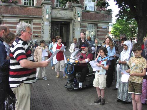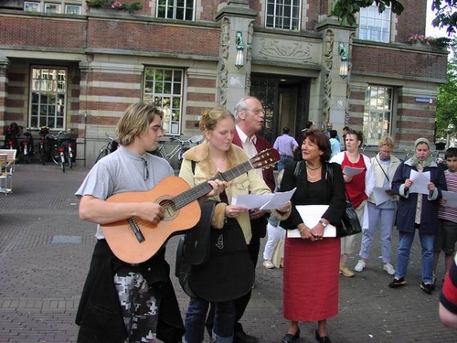 De Onderwijswinkel en het Muziekcentrum, beiden in Leiden-Noord, worden met sluiting bedreigt. De afdeling Cultuur en Educatie van de gemeente heeft geen geld meer voor de 30-jarige instelling. Medewerkers, vrijwilligers en cursisten van de onderwijswinkel boden vanavond op het Stadhuisplein een muzikale petitie aan aan de voorzitter van de raadscommissie Sociale Infrastructuur, Greetje van Gruting. “De Onderwijswinkel, die moet blijven en Muziekcentrum Leiden-Noord, die hebben al zo velen jaren, tot Leiden-Noord behoord…” zo klonk het uit enkele tientallen kelen. De Onderwijswinkel en het Muziekcentrum Leiden verzorgen onder meer taallessen en huiswerkbegeleiding in de wijk.