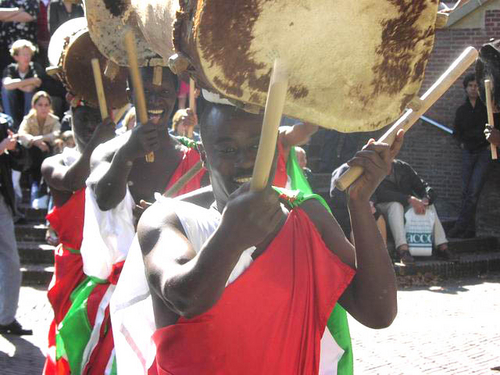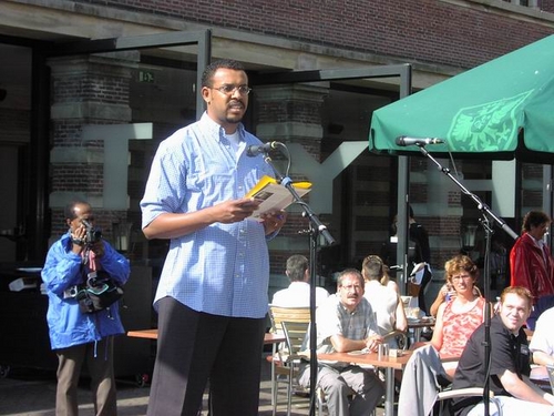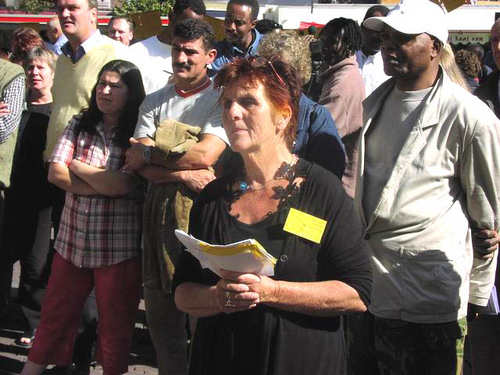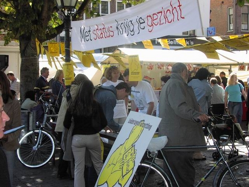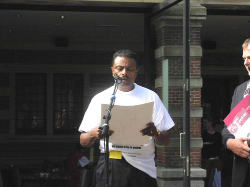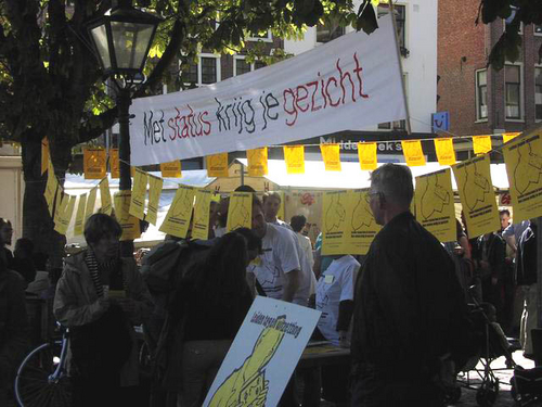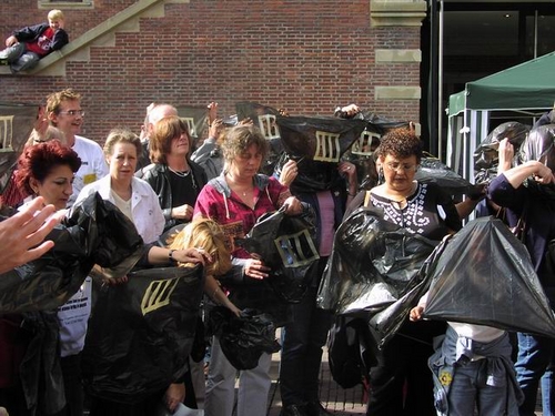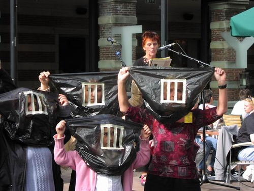 Bij de aanvang van de manifestatie trok een groep betrokkenen een zwarte plastic tas over het hoofd onder het motto ‘met status krijg je een gezicht.’ “Veel vluchtelingen zijn hier onzichtbaar, omdat ze niet te koop lopen met het feit dat ze geen verblijfsvergunning hebben. Het kunnen dus ook heel goed uw buren zijn, waar het hier om gaat,” zo klonk het vanaf het podium.