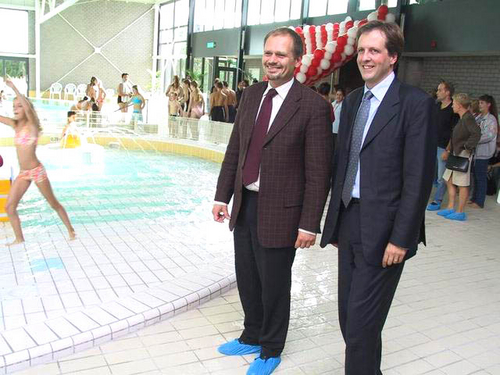 De wethouders Pechtold (sport) en Hillebrand (wijkontwikkeling) openden vrijdagmiddag officieel het verbouwde Zwembad de Zijl. (Foto's: Bram Pater en Chris de Waard).