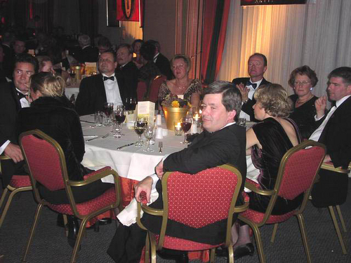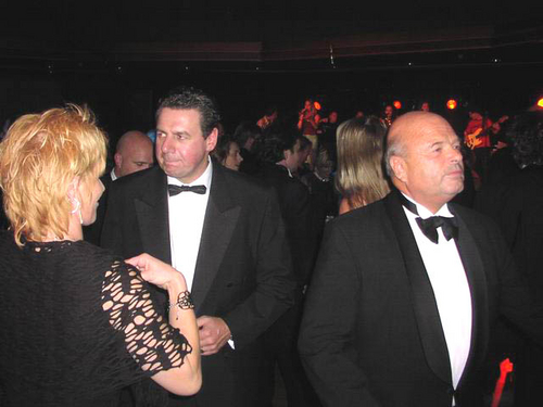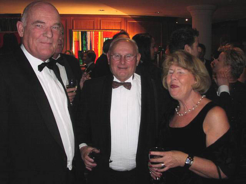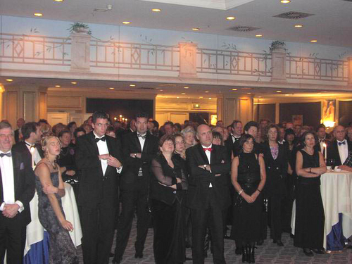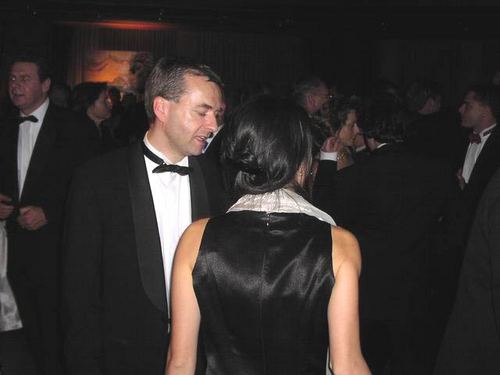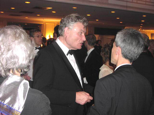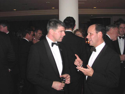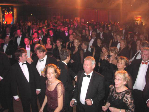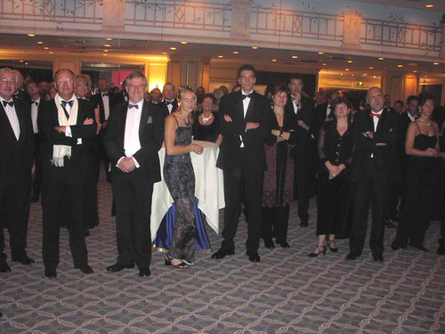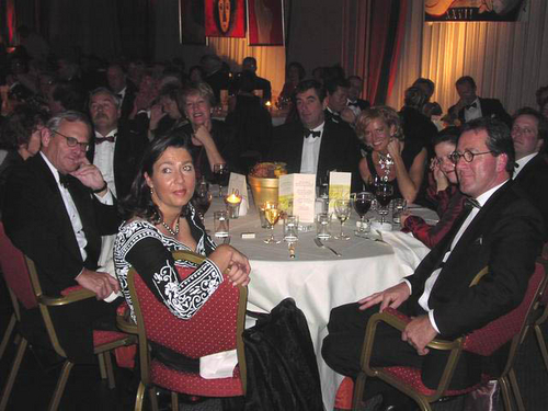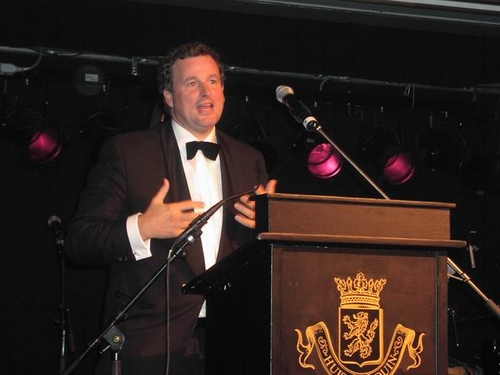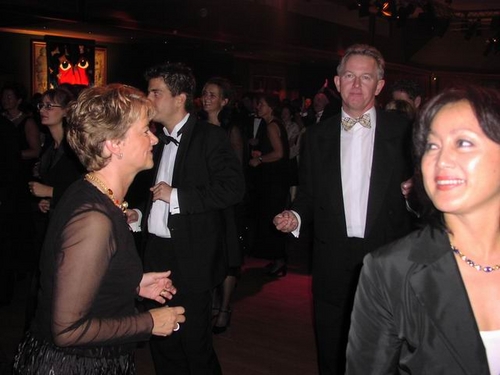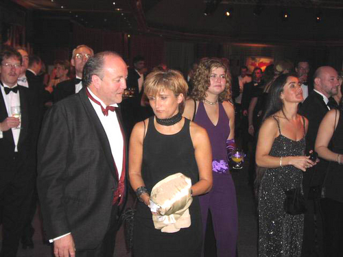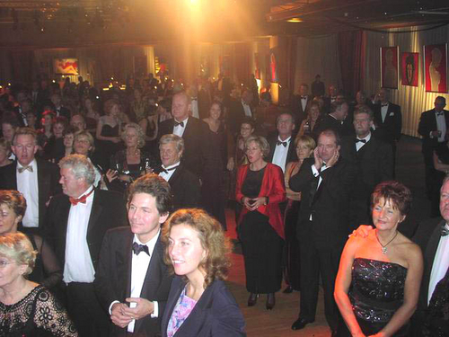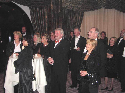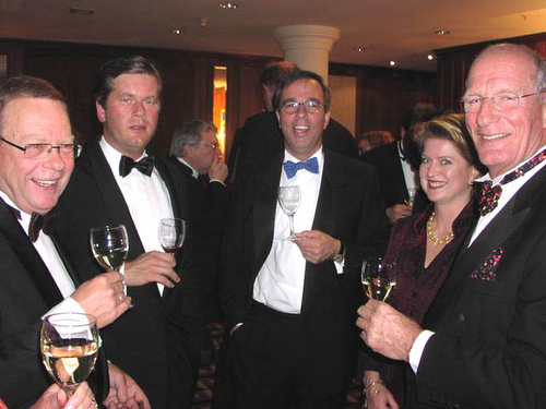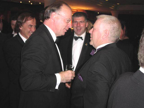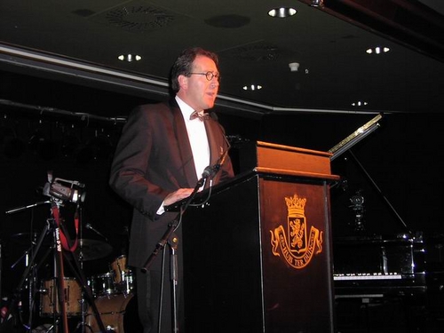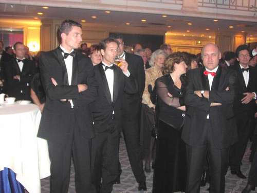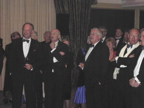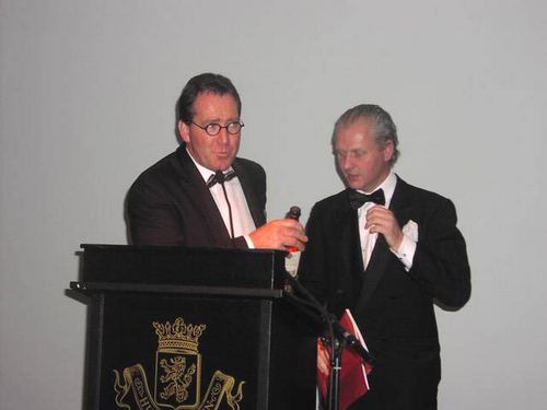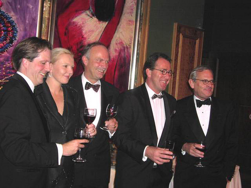 Voorzitter Chris Verplancke (2e van rechts) van de Stichting Rembrandtgala poseert met de Noordwijkse burgemeester Harry Groen (uiterst rechts). In het midden directeur Jan van den Bosch van de Fortis bank die net als vorig jaar als hoofdsponsor optrad. Ook de Wageningse burgemeester Alexander Pechtold kan nog niet helemaal buiten Leiden en was dus aanwezig.
