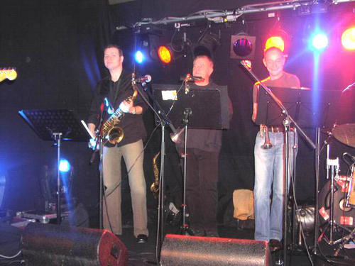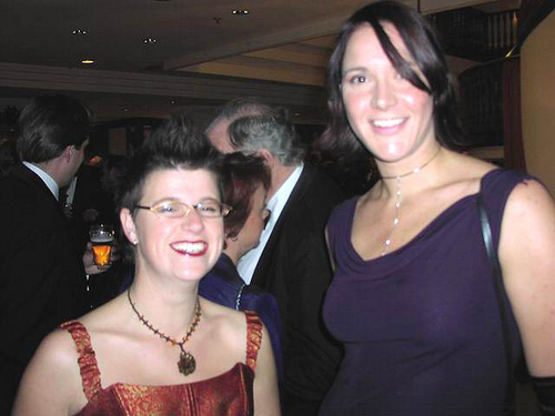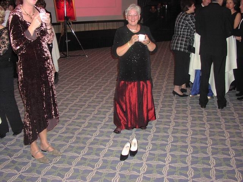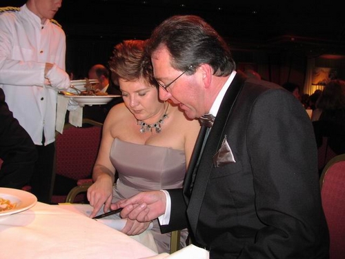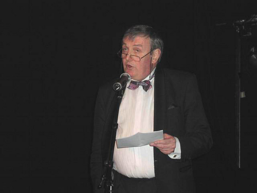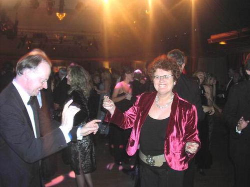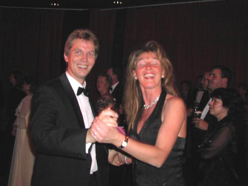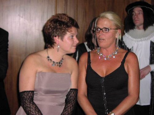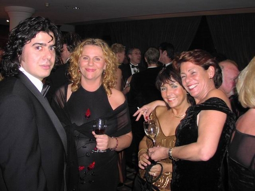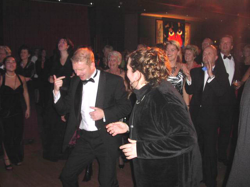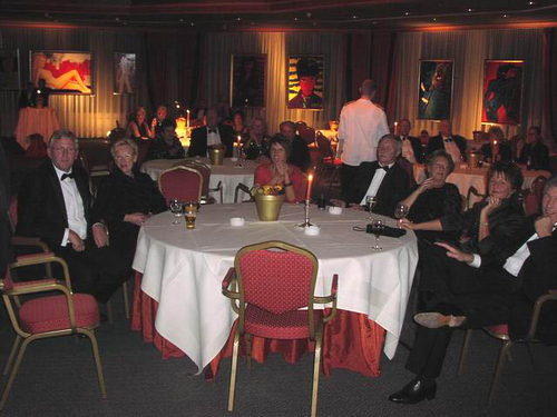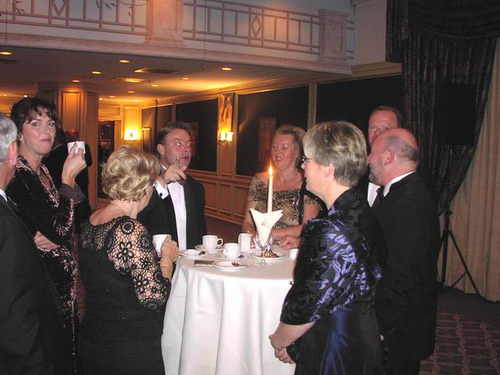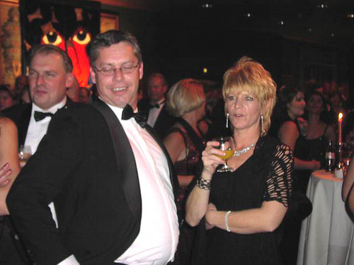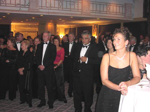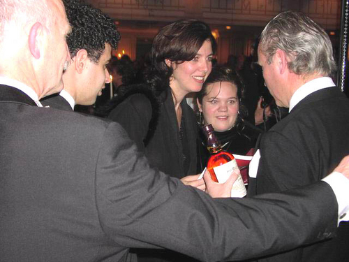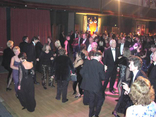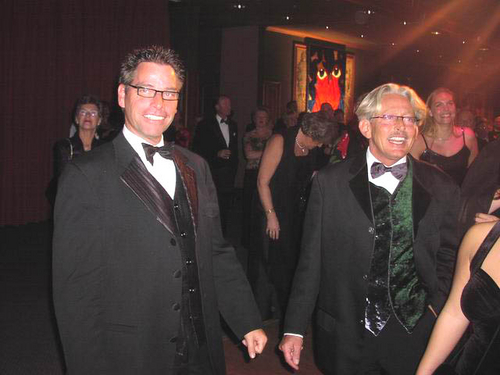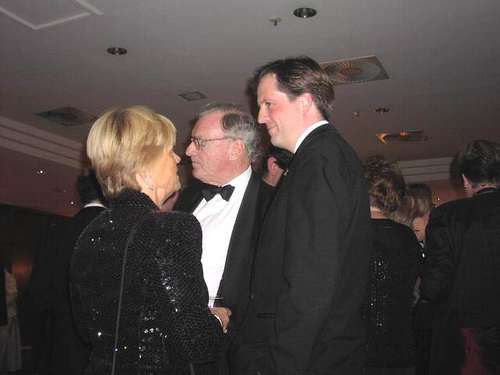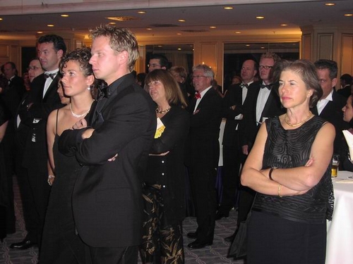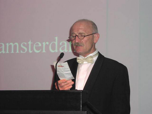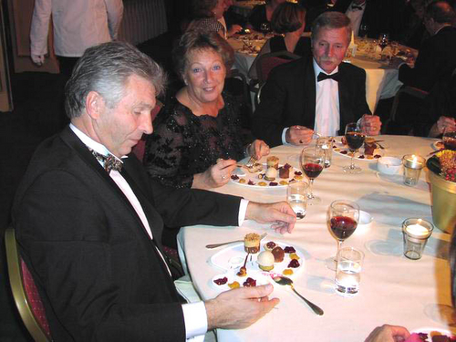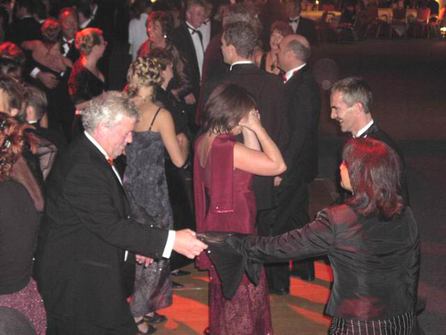 Voorzitter Chris Verplancke (2e van rechts) van de Stichting Rembrandtgala poseert met de Noordwijkse burgemeester Harry Groen (uiterst rechts). In het midden directeur Jan van den Bosch van de Fortis bank die net als vorig jaar als hoofdsponsor optrad. Ook de Wageningse burgemeester Alexander Pechtold kan nog niet helemaal buiten Leiden en was dus aanwezig.