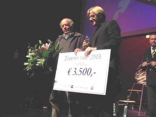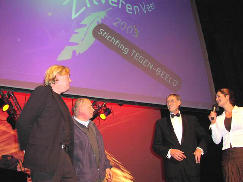 Voor de vierde keer genomineerd en nu eindelijk ook echt winnaar van de Zilveren Veer Cultuurprijs: De mensen van de Stichting TEGEN-BEELD met rechts voorzitter Piet van Veen en naast hem Jan-Willem Bruins. (Foto's: Chris de Waard).