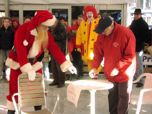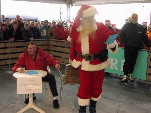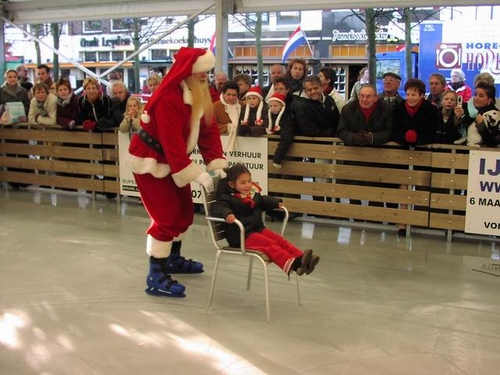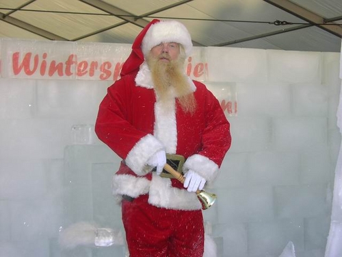 Nadat een metershoge ijsmuur met behulp van kettingzagen was afgebroken, kwam kerstman Peter Labrujère tevoorschijn uit de ijsmassa. Hij maakte aansluitend als eerste een rondje over de ijsbaan waarvan hij jaren terug al de geestelijke vader was. (Foto's: Chris de Waard).