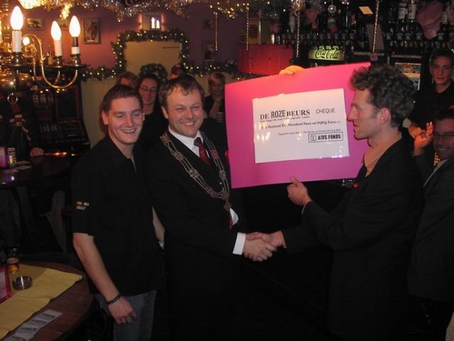 Burgemeester Henri Lenferink heeft woensdagavond een cheuqe van bijna 4000 euro overhandigd aan de organisatie Stop Aids Now. Het geld is op maandag 1 december, Wereld Aids Dag, ingezameld bij Gaycafe De Roze Beurs aan de Oude Singel. Een loterij en veiling leverde zo’n 1500 euro op. Met de entreegelden en een deel van de baromzet, kwam de totale opbrengst op 3652,97 euro.