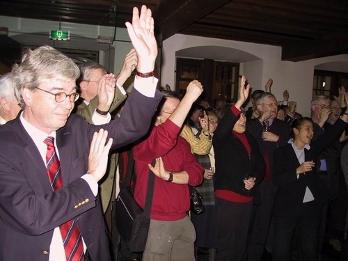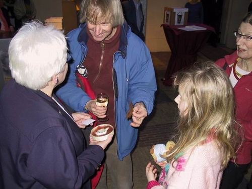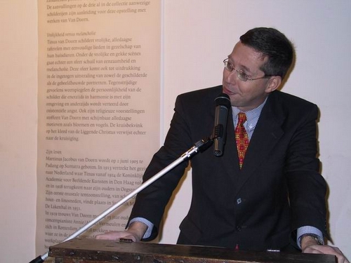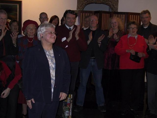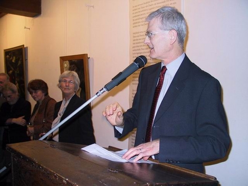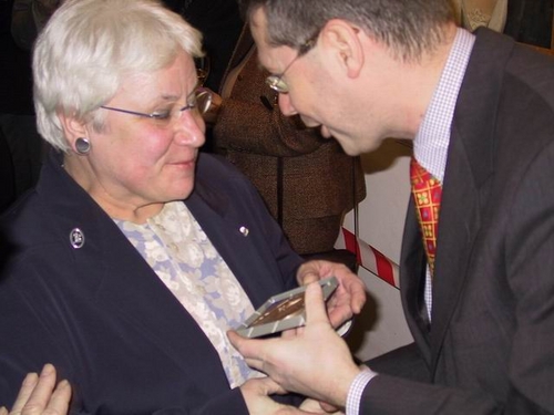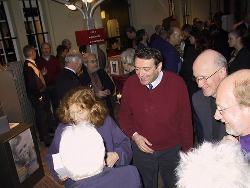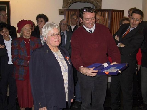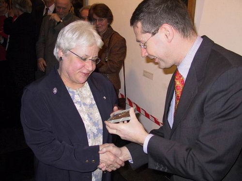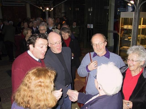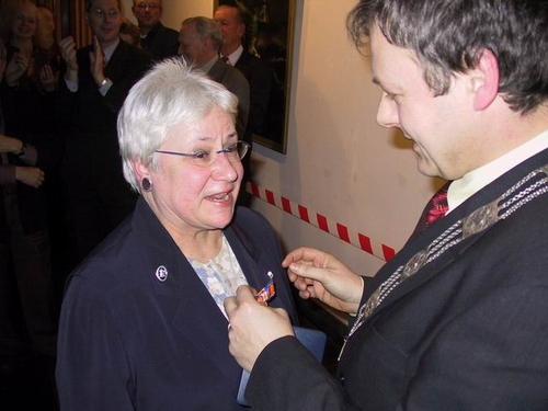 D66-wethouder Ruud Hessing overhandigt Ingrid Moerman namens de gemeente Leiden de Jan van Houtpenning. Even later speldde burgemeester Lenferink haar ook nog de versierselen op die horen bij haar benoeming tot Ridder in de Orde van Oranje-Nassau. (Foto's: Bram Pater).