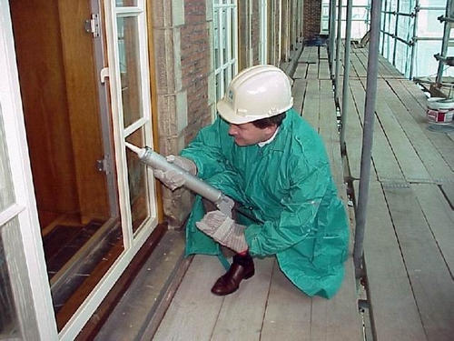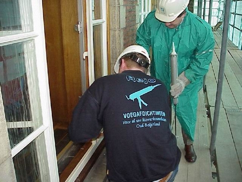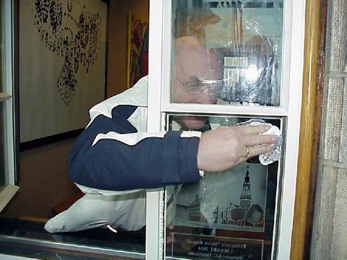 Inmiddels zijn de ramen op de vierde, derde en eerste etage vervangen en is de tweede etage aan de beurt. Zoals het een echte bouwvakker betaamt, voert de wethouder de actie vanaf de steiger uit.