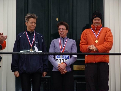 Het bordes van een huis met de toepasselijke naam “Maasstede” diende alsgeïmproviseerd erepodium. Hierop mochten naast Kamiel nog twee atletenvan Leiden Atletiek plaatsnemen om een NK-medaille in ontvangst tenemen. Zo behaalde Jaap van Duijvenvoorde (1.10.58) een zilverenmedaille bij de mannen veteranen en Karin Nierop (1.42.15) werd deverrassende derde bij de veteranen vrouwen. Jaap lijkt daarmee prima opkoers te liggen voor de marathon van Rotterdam over twee weken, waar hijzijn nationale veteranentitel wil gaan verdedigen. In de Maasstad zalRené van Dijke zijn debuut op de klassieke afstand maken. In Den Haagfinishte hij in 1.11.55 op een 34e plaats en als 16e op het NK.