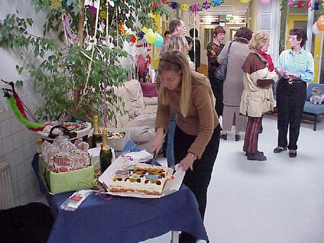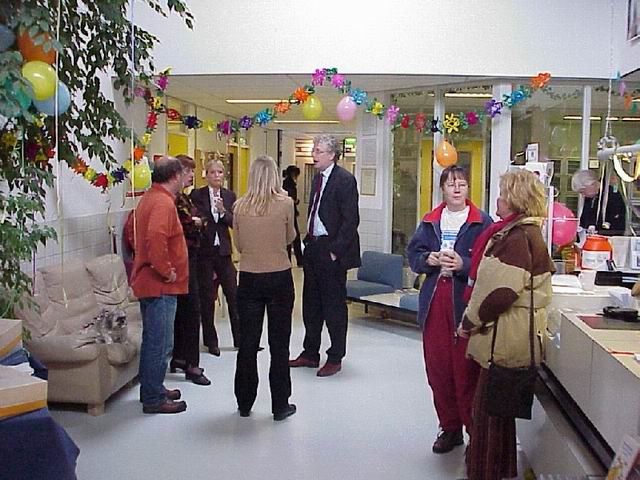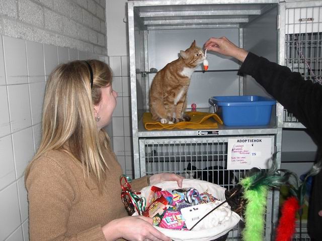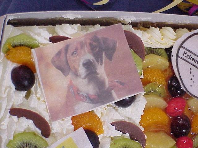 Het erkenningbordje werd aangereikt door hond Cas (ja, deze heeft al een baas…), want in Stevenshage draait alles om de dieren en dat is ook hierbij te merken. Na afloop van het officiële gedeelte van de feestelijkheden werden eerst de honden in het asiel verrast met een kong (speelbot van rubber waar wat lekkers in kan) en de katten kregen ook lekkers en kattenspeeltjes. Pas daarna was het tijd voor taart en drinken voor de mensen. Op de taart stond de afbeelding van asielpoes Arie. Zij is de eigenlijke ‘directrice’ van Stevenshage en heeft het gebeuren van vanmorgen op de haar eigen stoïcijnse manier ondergaan. Dat er nou niemand vandaag de pot met melkpoeder even wilde laten vallen of zelfs maar op een bereikbare plek open wilde laten staan heeft haar diep teleurgesteld. Maar verder is ook zij zeer tevreden met de kwaliteit van de verzorging in Stevenshage.