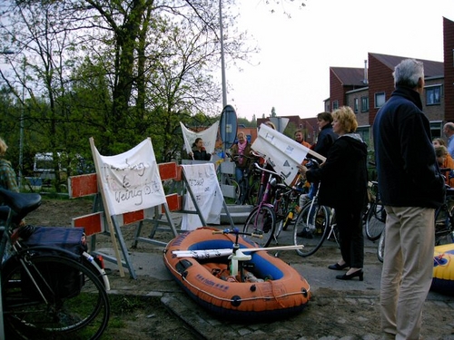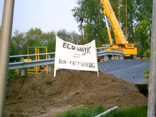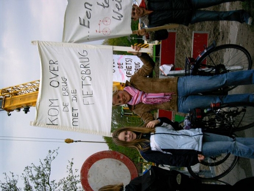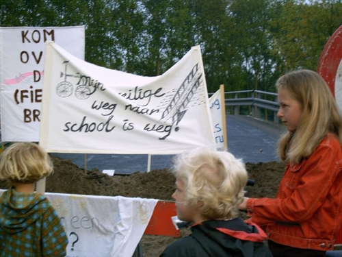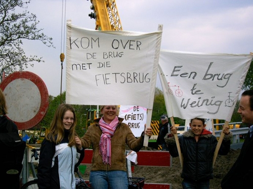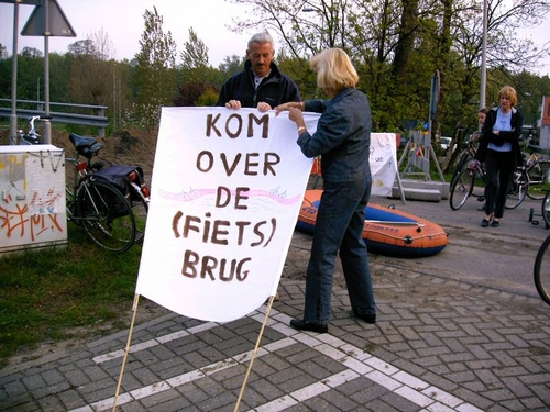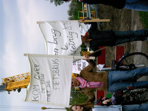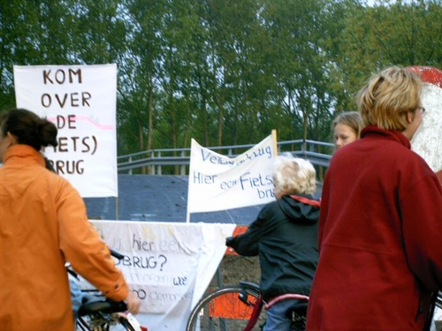 De bouwbrug bij nieuwbouwwijk Poelgeest, vlakbij de sportcomplexen van UVS en Lugdunum, werd woensdagochtend met groot materieel verwijderd. Dat leidde tot grote woede onder de wijkbewoners, die er vanwege de bezuinigingen waarschijnlijk niets voor in de plaats terugkrijgen. De alternatieven zijn waardeloos en vooral erg onveilig, aldus de bewoners tijdens hun protestdemonstratie.