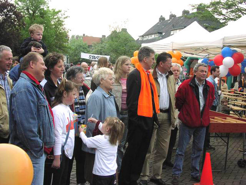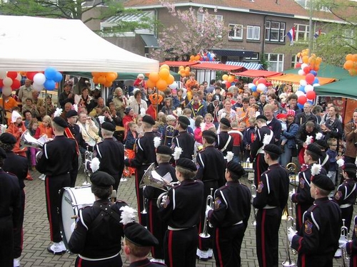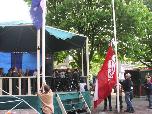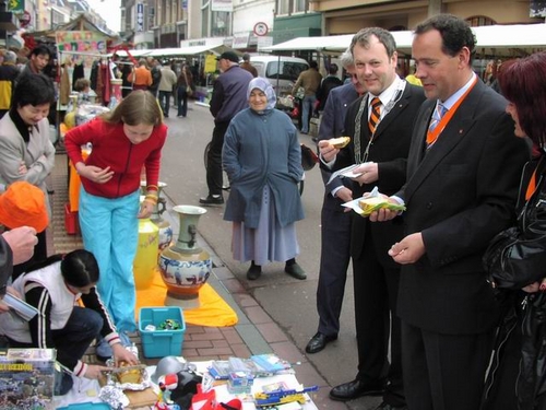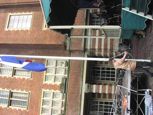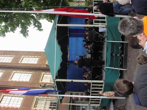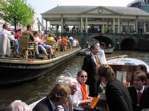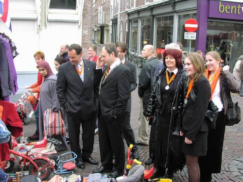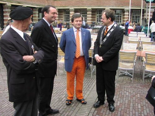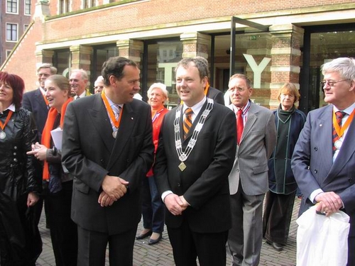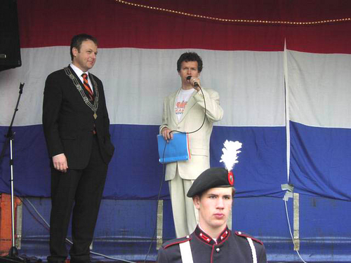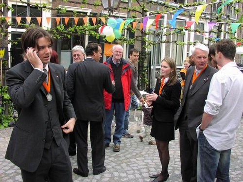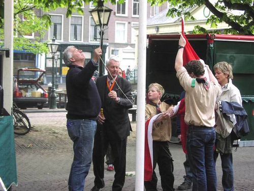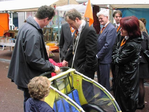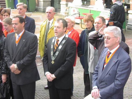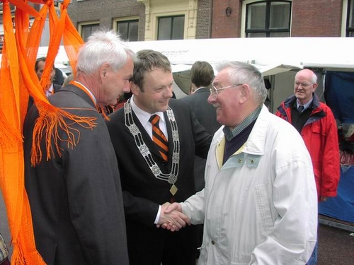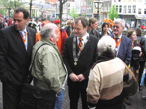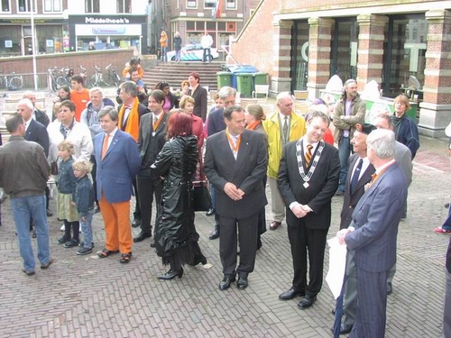Koninginnedag begon in Leiden rond 8.45 uur met het hijsen van de Leidse en de Nederlandse vlag op het Stadhuisplein. Aansluitend vond er een korte bijeenkomst plaats in de burgerzaal waar voorzitter Bert van der Velde van de Vereniging Koninginnedag Leiden (VKL) en burgemeester Lenferink het woord tot de aanwezigen richtten. Van der Velde memoreerde dat hij nu voor het derde achtereenvolgende jaar met een nieuwe burgemeester Koninginnedag vierde. “Een traditie die we maar snel weer moeten afschaffen,” vond Lenferink op zijn beurt.