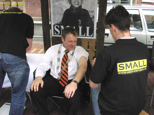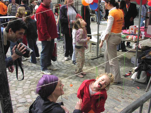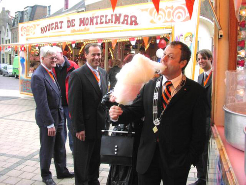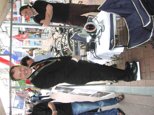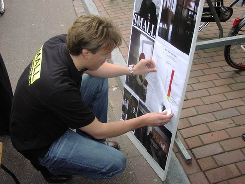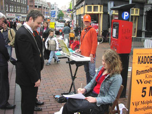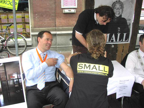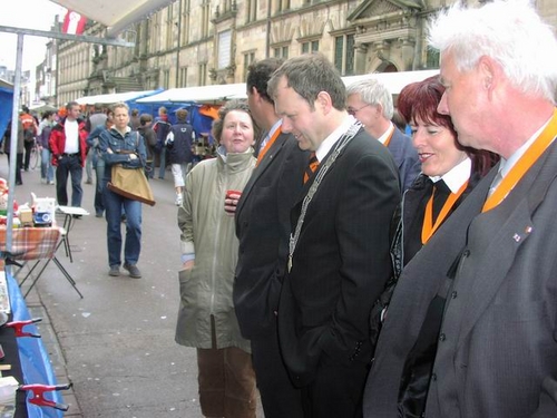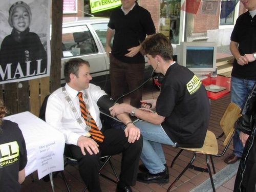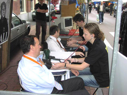 Burgemeester Lenferink liet op de Breestraat zijn Body Mass Index (BMI) berekenen. 1.83 meter en 93 kilo... oeps... iets te zwaar. Lenferink: "Zonder ambtsketen is het precies goed." (Foto's: Chris de Waard, Raymond Harper en Reinoud Verweij van L.S.V Minerva).