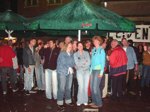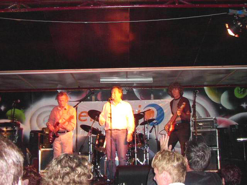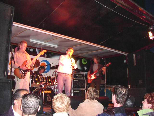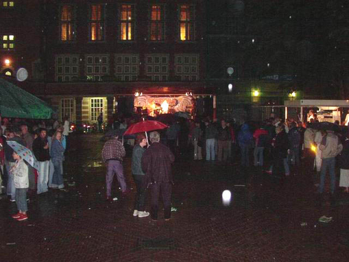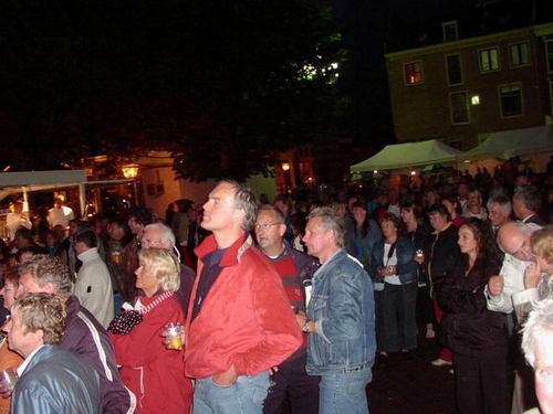Terwijl in het Stadhuis het Avondspektakel bezig was, ging het buiten-optreden van The Shoes op het Stadhuisplein wel door. Ondanks de dreigende wolkbreuk. De band van de Leidse broers Versteegen trekt nog steeds volle zalen, of in dit geval, een vol plein. Maar dat liep snel leeg toen het water in de loop van de avond inderdaad met bakken uit de hemel viel.