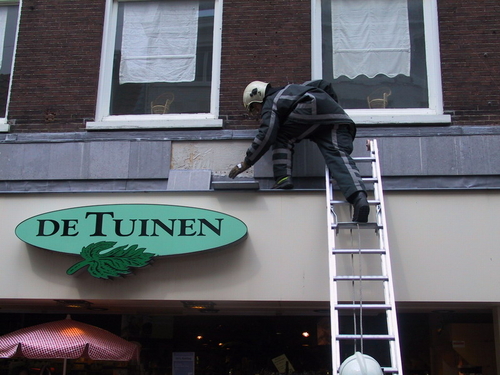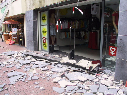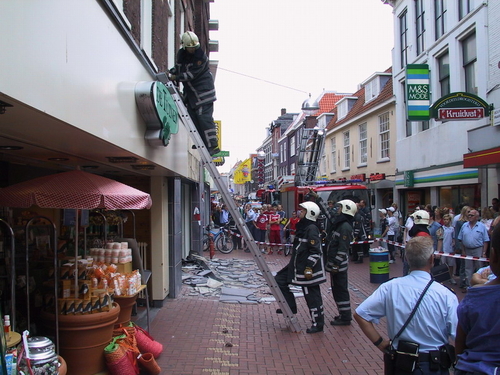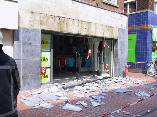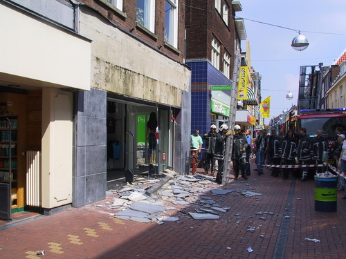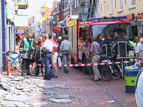 Een lading tegels en een lichtbalk van de gevel van Wonder Woman donderde woensdagmiddag met veel kabaal op de grond. De brandweer moest ter plaatse komen om de brokstukken rondom de dameskledingzaak aan de Haarlemmerstraat op te ruimen. De brandweer haalde op het dak nog meer losse tegels weg. Hoewel het erg druk was op Haarlemmerstraat, raakte niemand gewond. Waarom er losse tegels op het dak lagen, is onduidelijk.