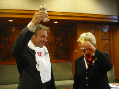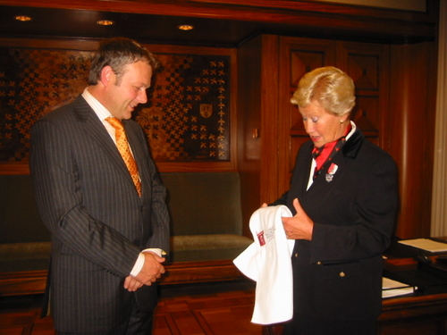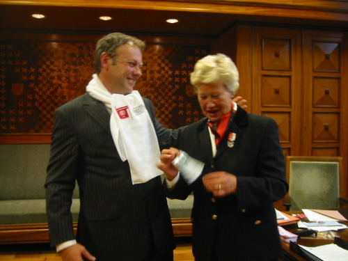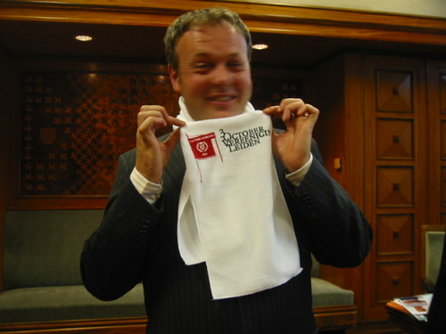 Bestuurslid Tileke Burger van de 3 Octobervereeniging vertelde deze week aan burgemeester Lenferink dat er een nieuwe 3 oktober-sjaal is. De sjaal is tijdens alle activiteiten van de vereniging te koop voor vijf euro. De eerste sjaal werd door Burger aangeboden aan burgemeester Henri Lenferink, die het bestuurslid trots bedankt en een toast uitbrengt. Ook Lenferink betaalt vijf euro voor zijn sjaal... (Foto's: Frans Lardee)