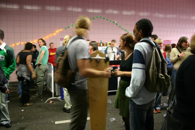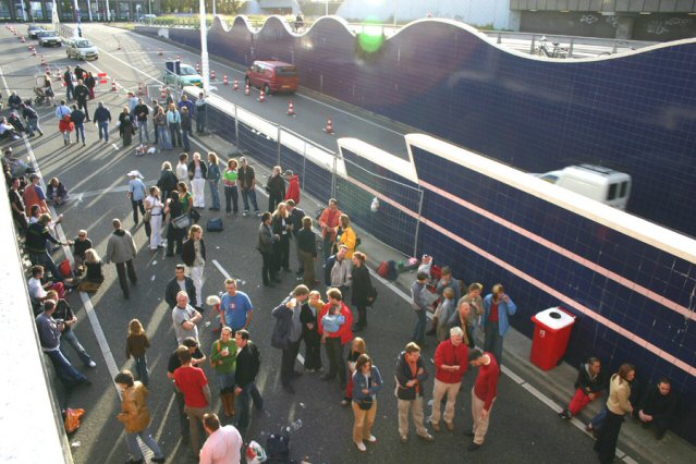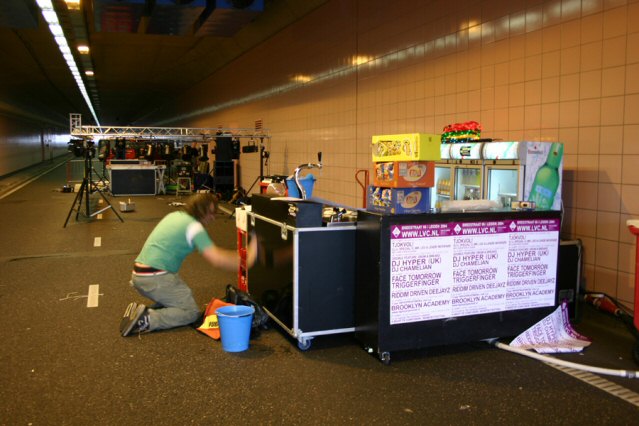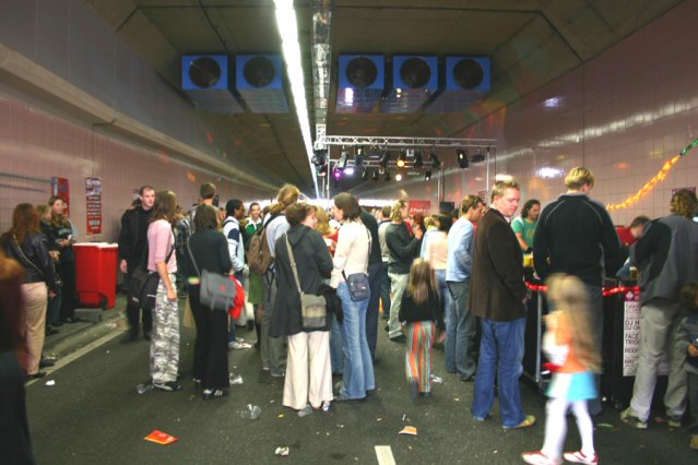 Een autoloze zondag in Leiden was het allerminst. In de naastliggende tunnel reden auto's op de maat van de dreunen van de disco voorbij. Toch waren de organisatoren, de Leidse PvdA en Het LVC, zeer tevreden met het verloop van de Tunneldisco. Het evenement kon rekenen op een paar duizend bezoekers. Om 15.00u waren de mensen van de organisatie nog druk bezig met de opbouw van de Tunneldisco in Leiden, maar drie uur later was de lege tunnel getransformeerd tot een stampende en dampende disco. Op de opzwepende tonen van DJ's Elmo de Pelmo en Sjimmie danste het overwegende jonge publiek op populaire en dansbare muziek. (Foto's: Boopie Willemse)