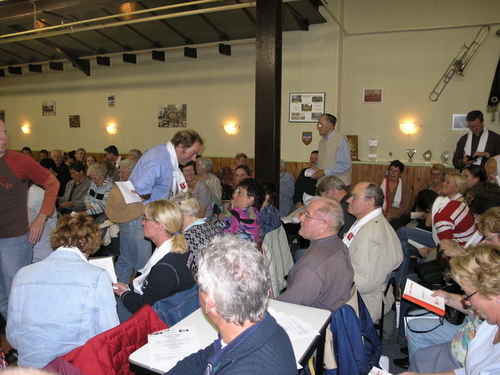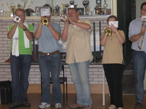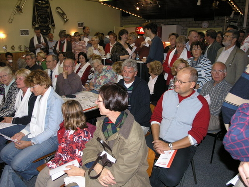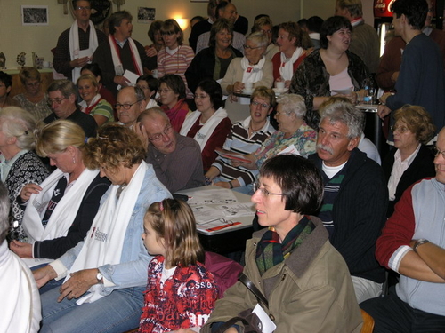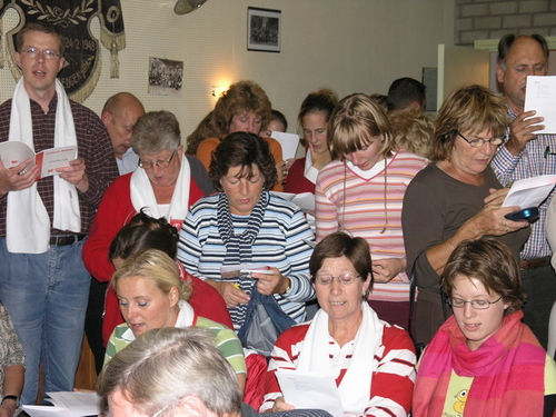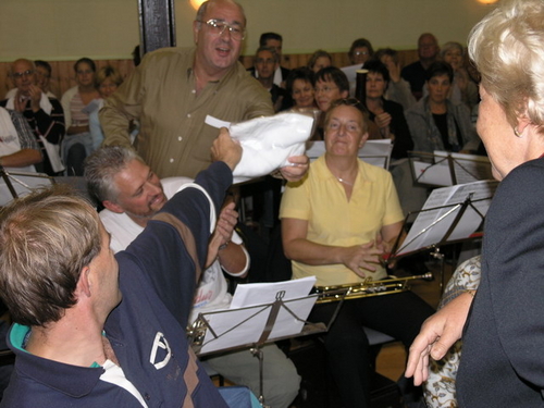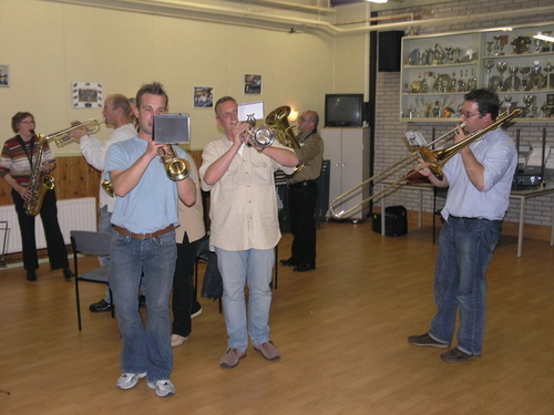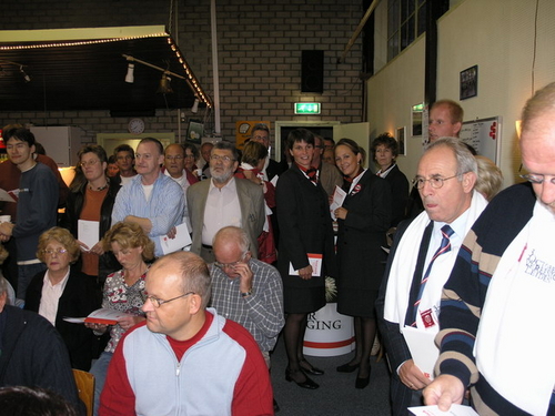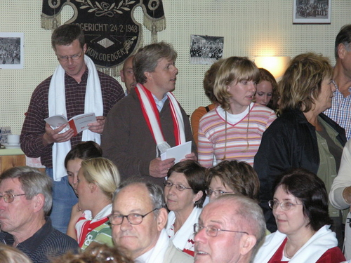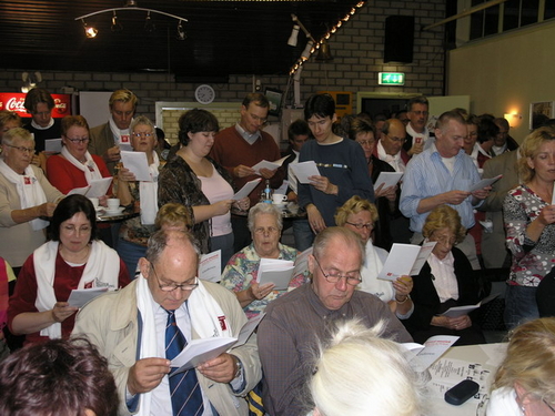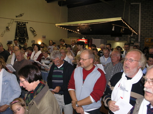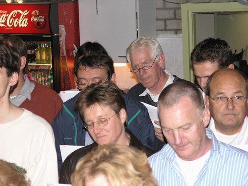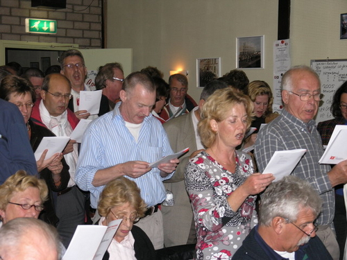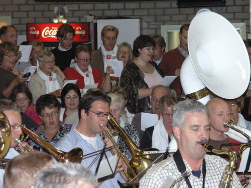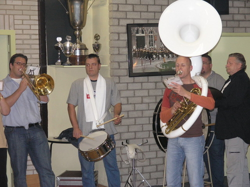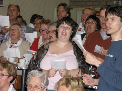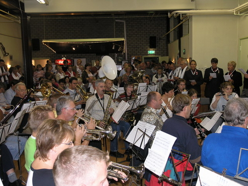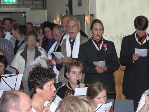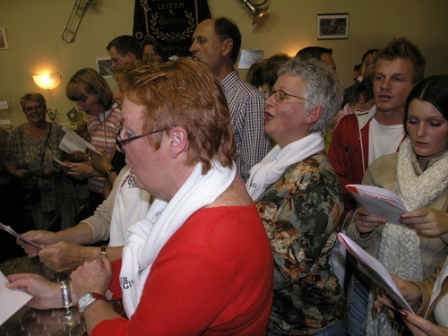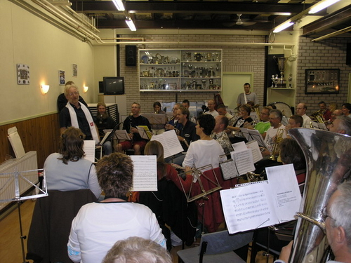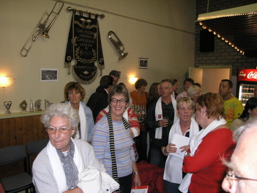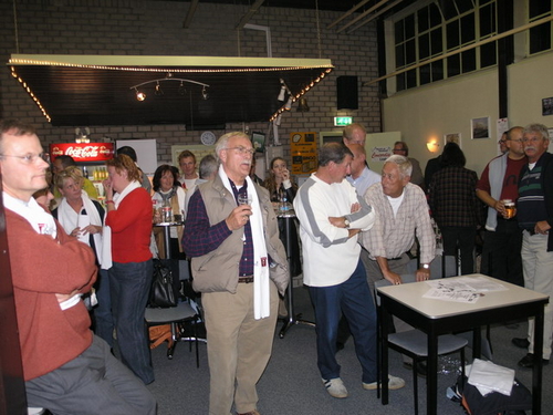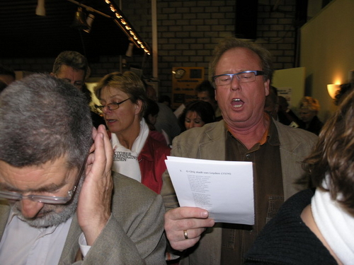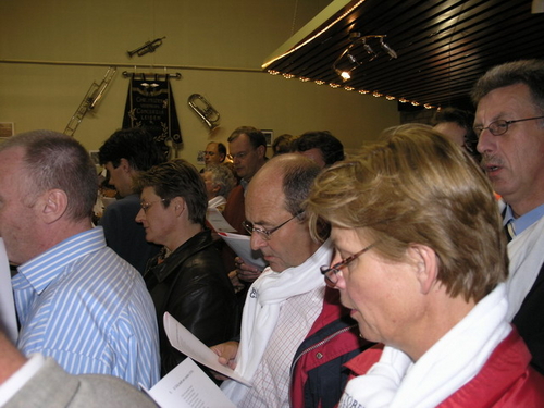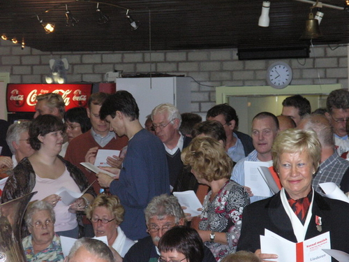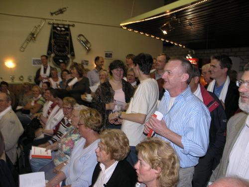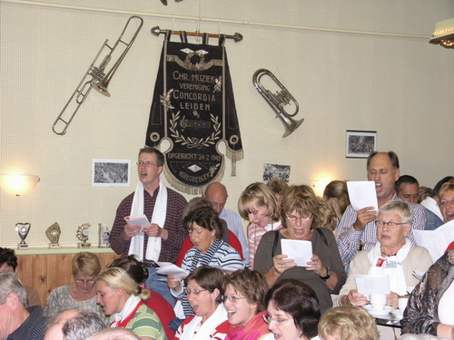 Vergeleken met vorig jaar kwamen ongeveer 1,5 keer zoveel Leidenaren woensdagavond op de oefensessie af. Dat is overigens een trend die al enkele jaren aan de gang is. Oud-voorzitter Claas Griffioen van de inmiddels wegens succes opgeheven ‘Vrienden van de Reveillle’ twijfelt dan ook of hij een nieuwe club op zal richten: “De Vrienden van de Koraaloefening”. “Als het zo doorgaat, passen de mensen over een paar jaar niet meer in het knusse zaaltje van Concordia”, vreest ook oud-bestuurslid van de 3 October Vereeniging, Annelies Koolen. “En zeg nou zelf, het is hier toch hartstikke knus.” Na afloop bleef het nog lang gezellig bij Concordia. De muzikanten hadden er nog geen genoeg van en speelden nog een tijdje vrolijk door. Tot groot genoegen van de achterblijvers.