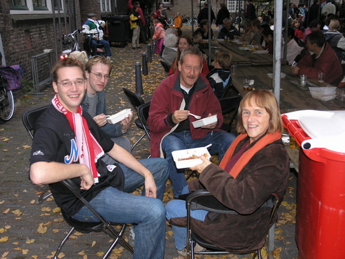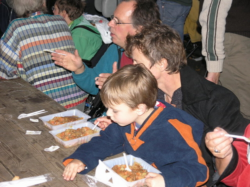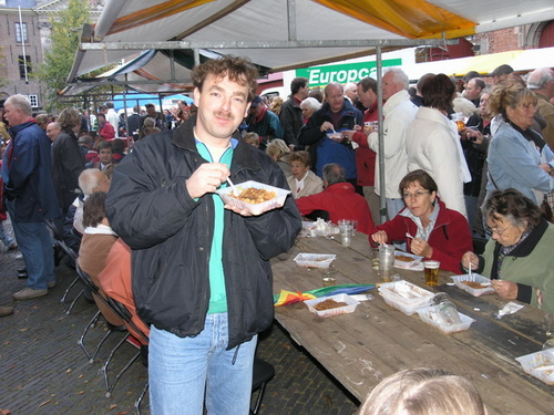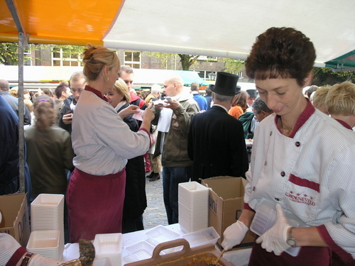 Lange rijen op het Pieterskerkplein voor de gratis hutspot met klapstuk. (Foto's: Chris de Waard).