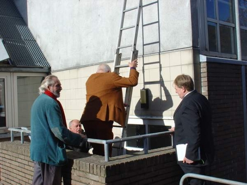 Professor Piet Schrijvers, parafeert blij verrast "zijn" gedicht. Een aantal jaren geleden was hij degene die het uitzocht als mogelijk project voor de Stichting Tegenbeeld. Over de uitvoering was daarna weinig meer gesproken. Vandaag, niet helemaal toevallig op zijn 65ste verjaardag, werd het onthuld en aan hem opgedragen. (Foto's: Sasha Meyer).