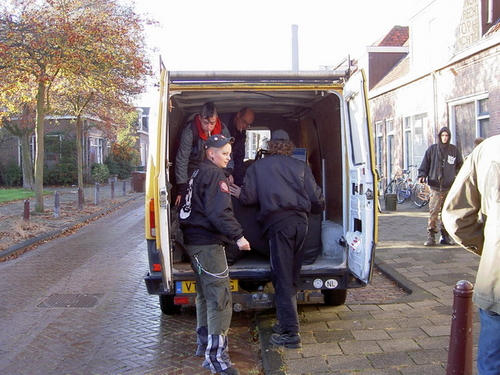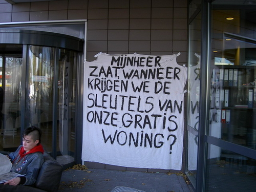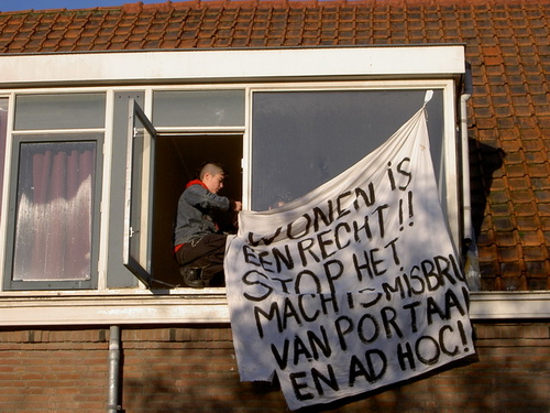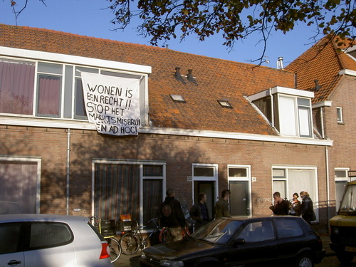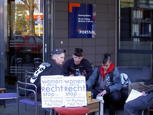 De krakers verzamelden vanmorgen om 10.00 uur bij het kraakpand dat op last van de rechter uiterlijk vandaag ontruimd moet worden om onder het motto ´Wonen is een recht, stop het machtsmisbruik van Portaal en Ad Hoc´ actie te voeren tegen de woningnood.