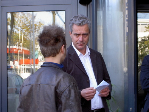 De krakers hebben vanmorgen het pand aan de Van Hogendorpstraat ontruimd. Vervolgens togen ze met huisraad en al naar het kantoor van Portaal waar een demonstratie werd gehouden. Op de foto directeur Lex de Boer van Portaal in gesprek met woordvoerder David van de Kraakgroep Leiden. (Foto's: Ed Walbeehm).