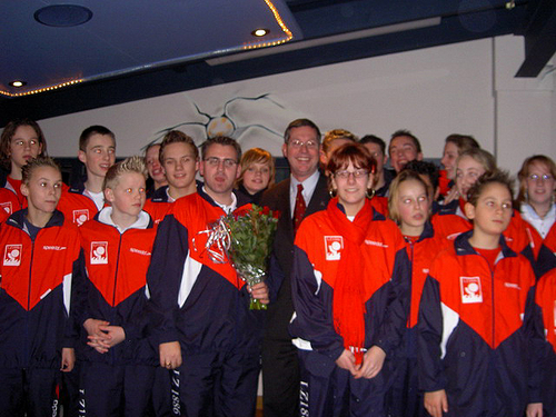 De Leidse Zwemclub op de foto met sportwethouder Ruud Hessing. (Foto's: Ed Walbeehm).