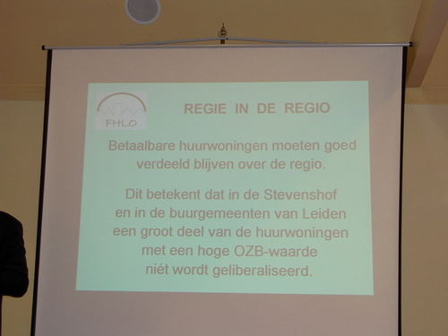Zaterdag werd er door de Federatie van Huurderbelangenorganisaties in Leiden en Omgeving (FHLO) een manifestatie gehouden over het nieuwe huurbeleid van Minister Dekker. Prof. Dr. Ir. Jan van der Schaar legde daarbij uit wat de impact zal zijn voor de huurders als het liberale plan van minister Dekker wordt uitgevoerd. Hij sprak daarbij van een ‘kleine revolutie’. Wethouder Ron Hillebrand en Lex de Boer van wooncorporatie Portaal vertelden over het huurbeleid van de gemeente Leiden. De algemene conclusies van deze sessie waren dat de plannen van minister Dekker om de huren in de sociale sector te liberaliseren vooral leiden tot grote onrust bij de huurders. In de huidige economische malaise is het niet verantwoord. De huren zullen in de komende 10 jaar met circa 50% stijgen en de minima kunnen de huurstijgingen niet kunnen opbrengen, zo is de vrees van veel huurders.