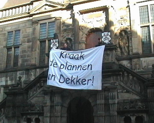 Staf Depla, PvdA-kamerlid, deed de suggestie om een demonstratie te houden tegen de plannen van de minister. Leden van de Kraakgroep Leiden gaven daar alvast gevolg aan door vrijdag actie te voeren tegen de plannen onder het motto ‘Kraak de plannen van Dekker!’