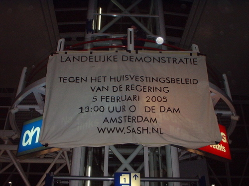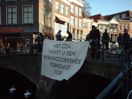 Om 13:00 ging de landelijke aktie die door kraakgroepen uit het hele land was bedacht ook in Leiden van start. Een spandoek met de tekst “Stop afbraak sociale huisvesting” prijkte in de Van Hogendorpstraat, terwijl activisten langs de te slopen woningbouwhuizen gingen om de bewoners een flyer aan te bieden. Daarnaast werden er spandoeken opgehangen aan het Stadsbouwhuis, het Stadhuis en de brug tegenover de V&D met respectievelijk de leuzen; ”Kraak de plannen van Dekker” en “CDA wenst u een woningzoekende toekomst toe.” Dat de positie van huurders steeds zwakker wordt bleek volgens de kraakgroep ook uit de reactie’s en de verhalen van mensen op straat.