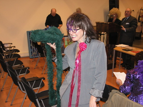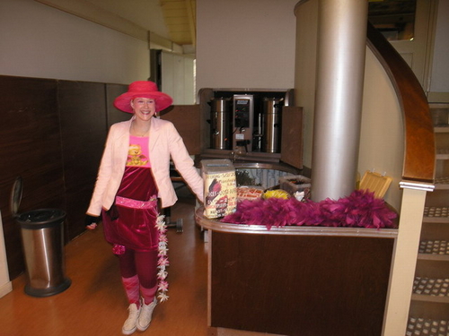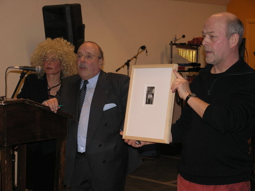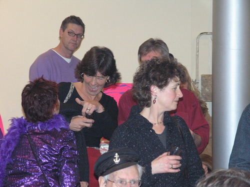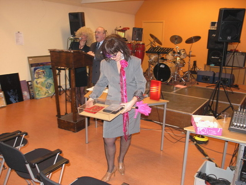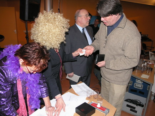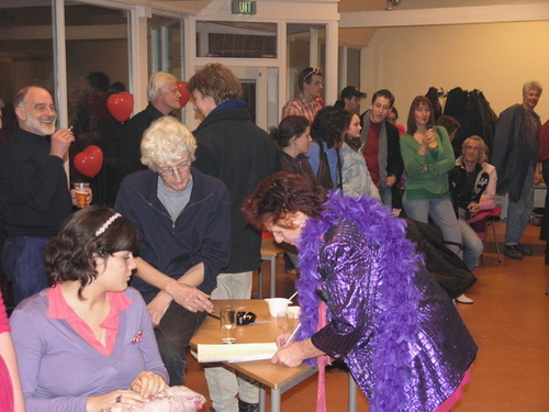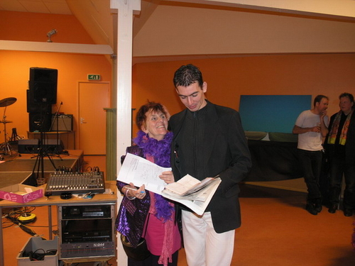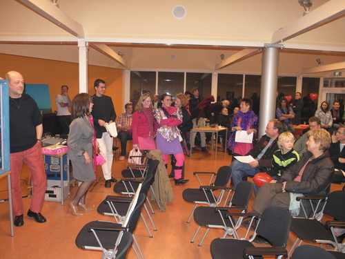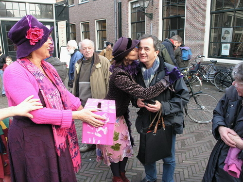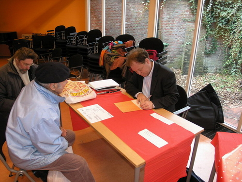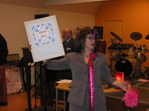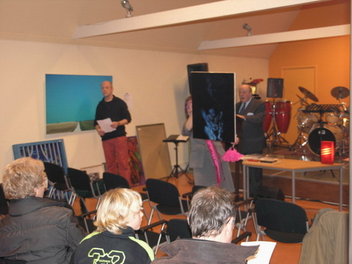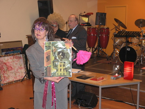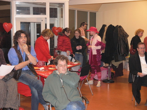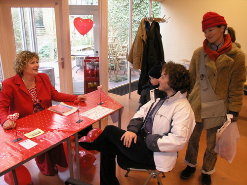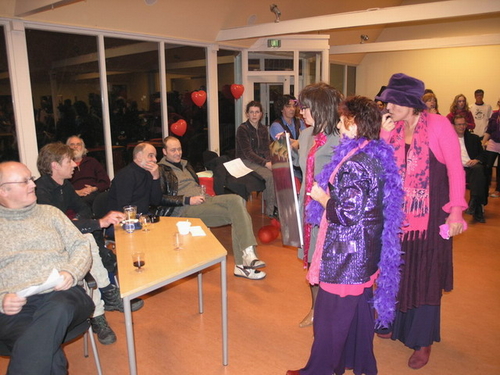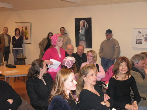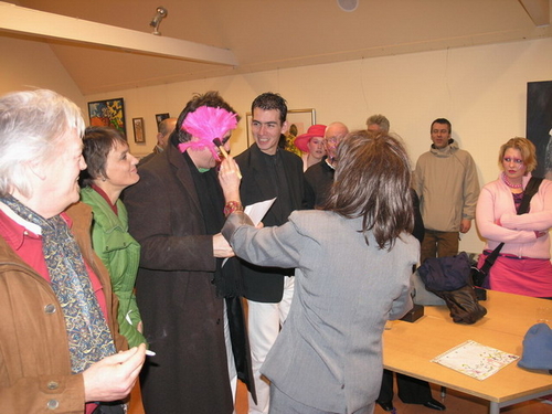 In de Tuinzaal van de Burcht kon iedereen ’s middgas alvast een kijkje nemen bij de te veilen kunstwerken. Ook zaten daar de Leidse dichters Pink Meltzer (mevrouw Cupido) en Egon Snelders klaar om naamgedichten te schrijven. Uiteraard in ruil voor een bijdrage voor het goede doel.