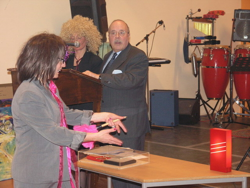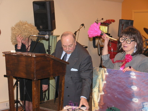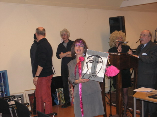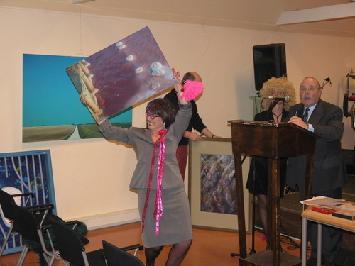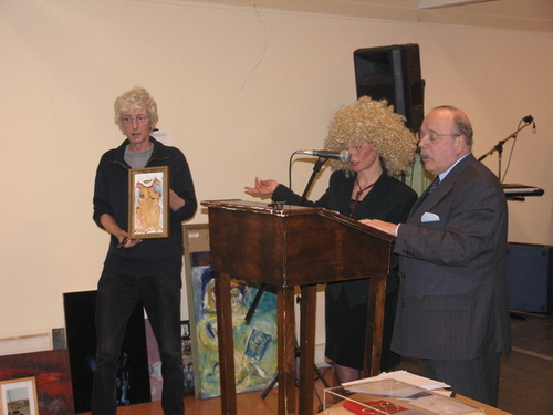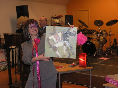 ’s Avonds kwam daar nog een fors bedrag bovenop toen een dertigtal kunstwerken van Leidse schilders en beeldende kunstenaars onder de veilinghamer van notaris Kroeks ging. Bijgestaan door de lieftallige assistentes Adele en Lola, werd er nog eens ruim 5.000 euro bij elkaar geveild.